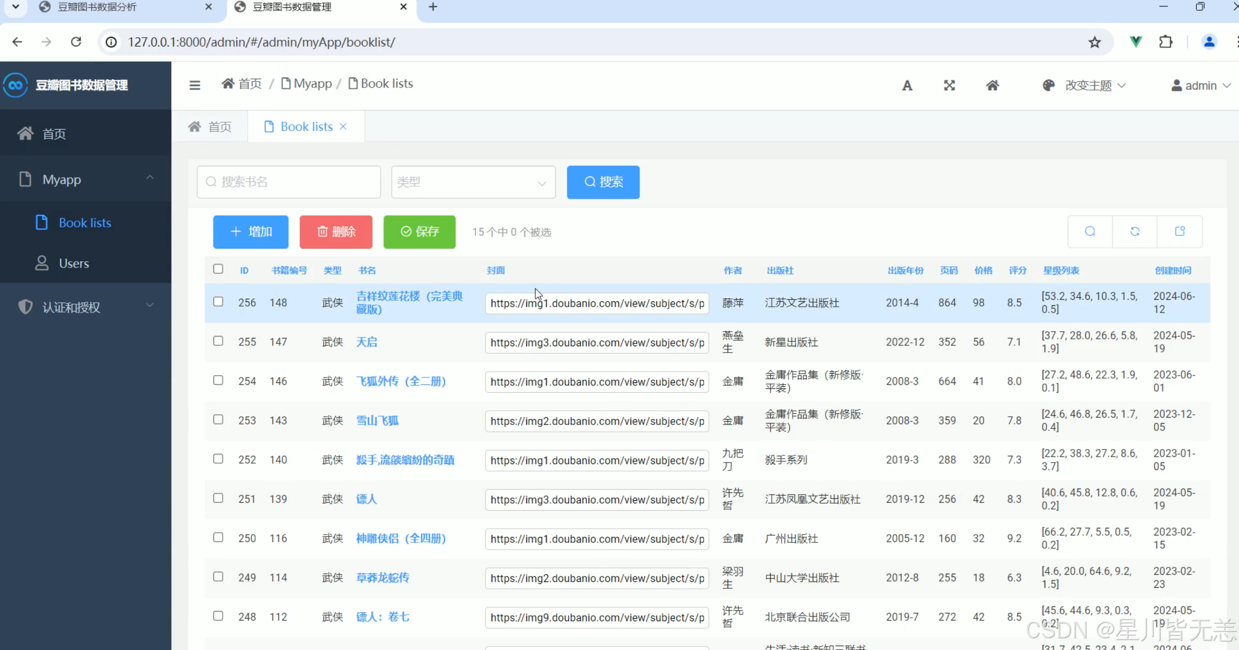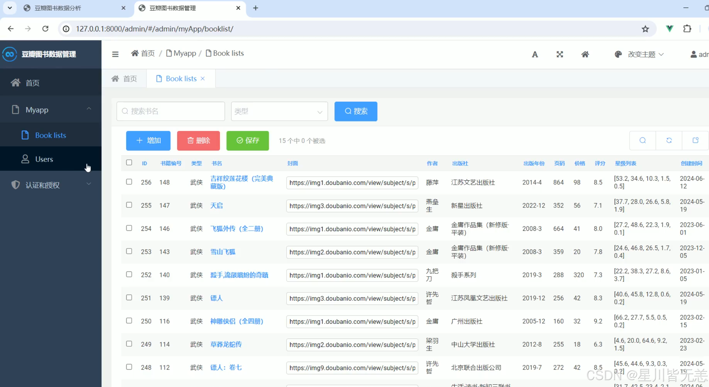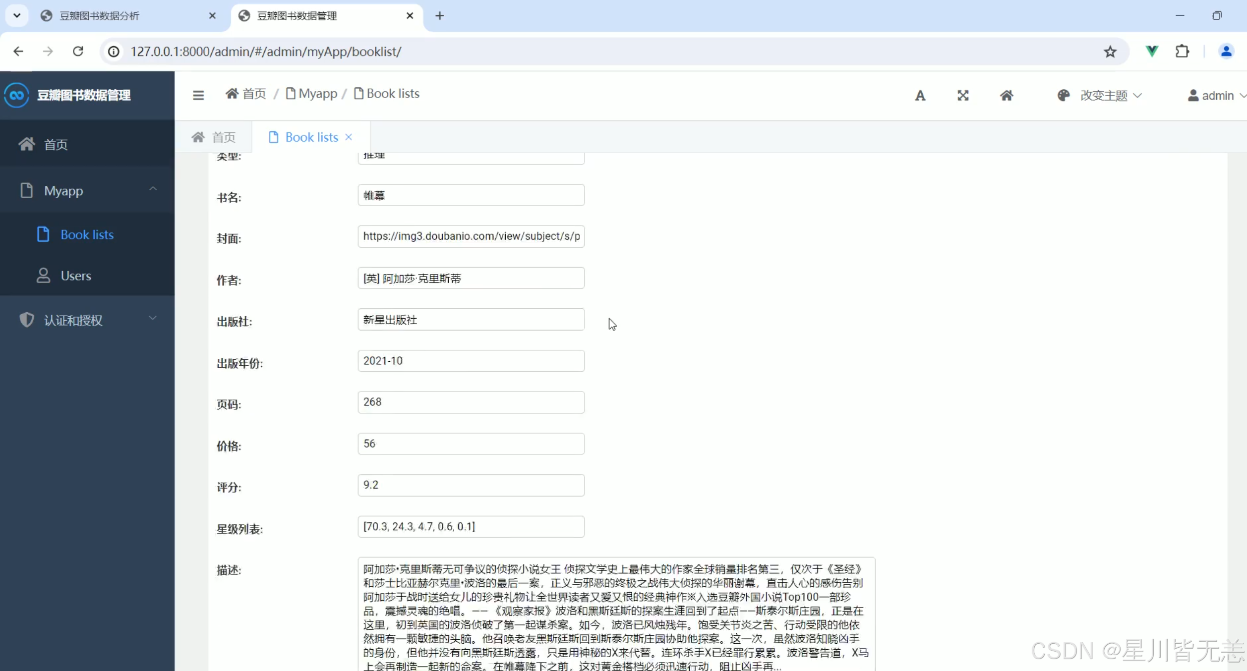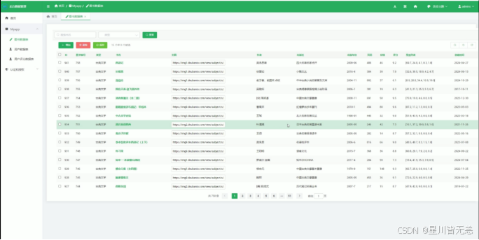 系统数据后台管理模块是本系统的管理与维护核心,主要用于对豆瓣书籍数据的管理、更新、分析和权限控制。该模块通过Django框架实现,提供了直观的图形化界面和功能,使管理员能够轻松进行数据的管理与监控。在数据管理方面,后台管理模块支持书籍信息的增删改查(CRUD)操作,允许管理员手动修改数据库中的图书信息,如书名、作者、评分、评论数等。同时,系统提供了数据更新功能,管理员可以根据爬虫获取的新数据对图书信息进行批量更新。