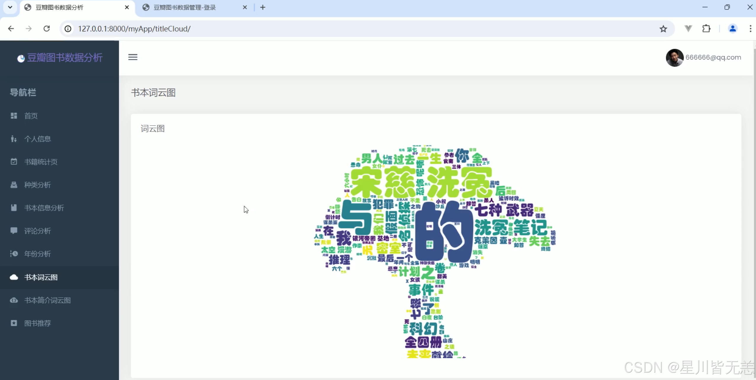 本研究旨在设计并实现一个基于Python的豆瓣书籍可视化分析系统,系统通过爬虫技术获取豆瓣上的图书数据,并结合MySQL数据库进行数据存储。通过Django框架进行后台管理,用户可以通过系统的Web界面查看各类图书信息分析结果。本系统涉及的分析功能包括最贵图书、最高评分图书、图书评分与评论分析等,以及通过词云展示图书标题与简介的关键词,为用户提供了一种全新的方式来浏览和理解豆瓣上的书籍数据。