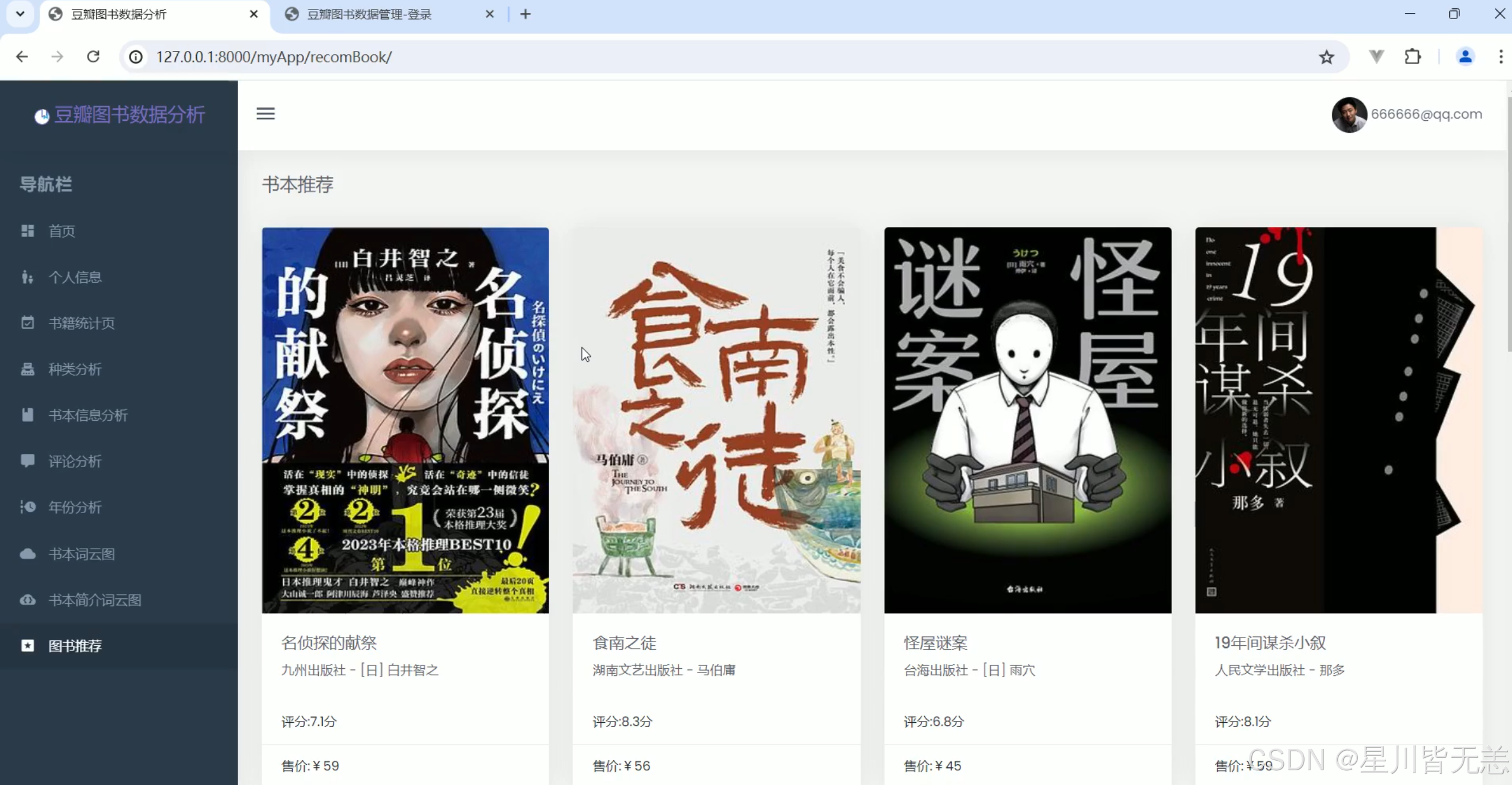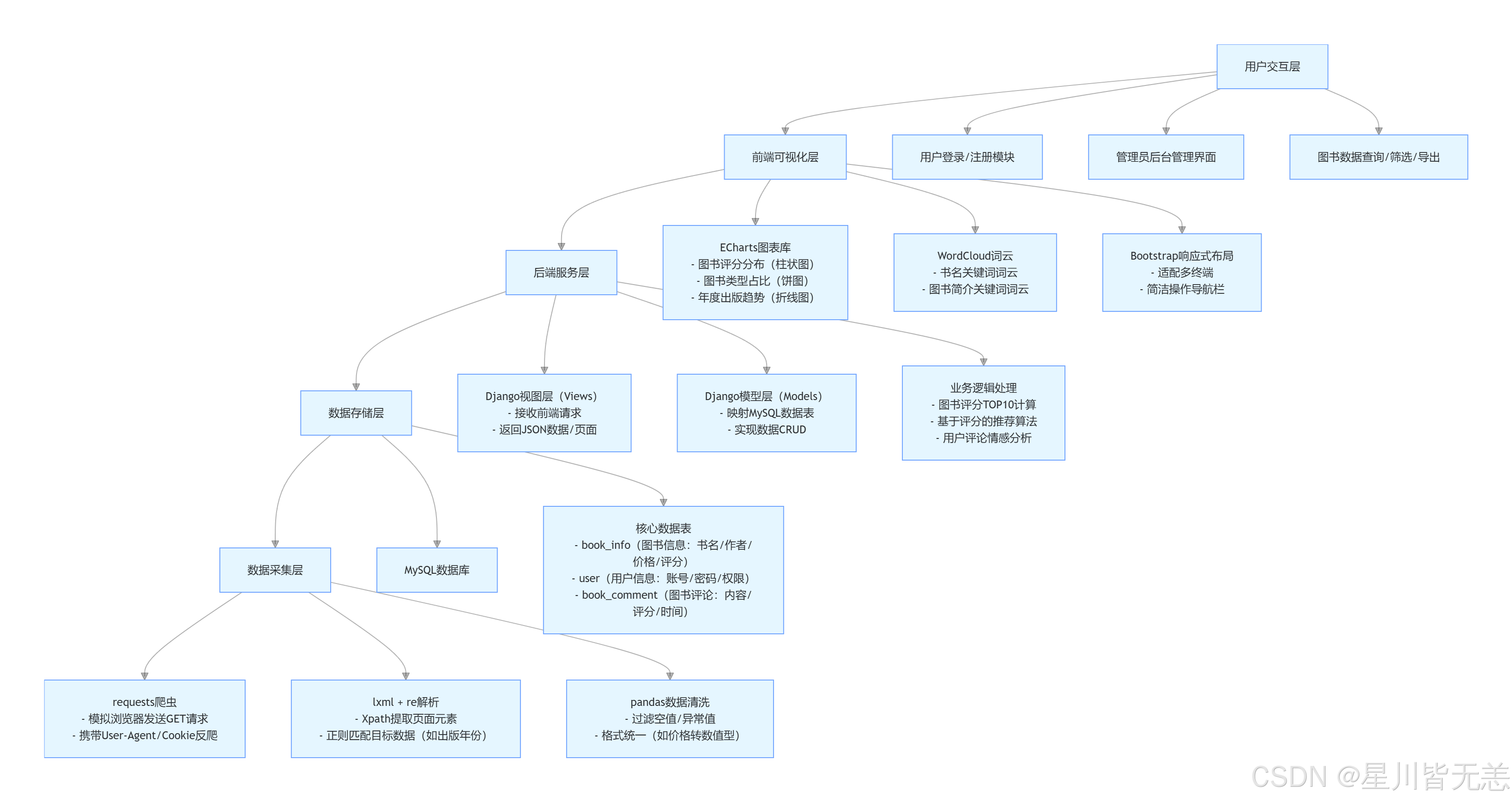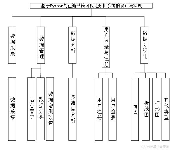 先明确系统的核心目标:从豆瓣爬取图书数据,通过 Web 界面实现多维度可视化分析(评分、价格、类型等),并支持后台数据管理。