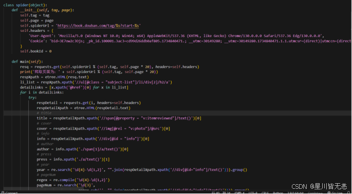 从豆瓣网站抓取书籍相关信息,并将数据存入数据库以供后续分析与可视化展示。为了实现这一功能,本系统使用了Python编写爬虫程序,利用了多个模块和库,如requests、lxml、re等。爬虫程序通过requests模块发送HTTP请求,获取豆瓣网站的页面内容。页面数据以HTML格式返回,接着通过lxml库解析HTML内容,提取出我们所需的书籍信息,如书名、作者、评分、价格、评论数等。为了确保数据的准确性和完整性,爬虫程序使用正则表达式(re)对网页中的特定数据进行提取,避免不相关信息的干扰。