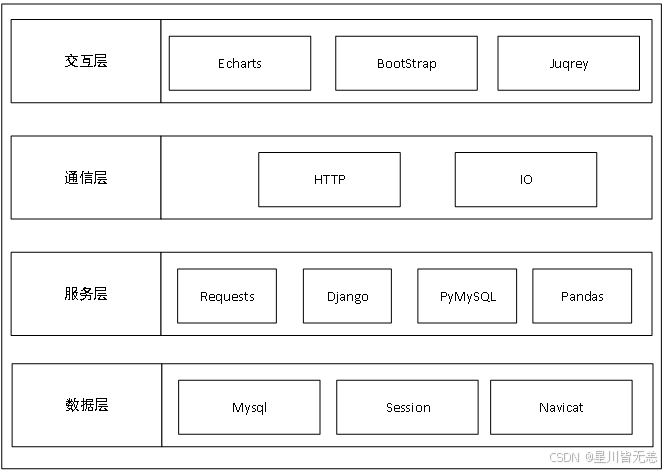 - 技术栈对齐:明确标注各层使用的核心技术(如 Django、ECharts、MySQL 等),与论文技术选型一致。