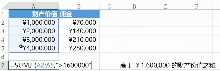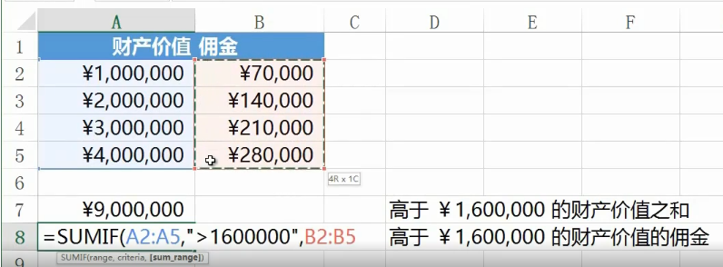 =SUMIF(A2:A5,">" & A4,B2:B5)