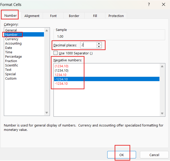 选中区域->右键单元格格式->数值,填写小数位数,注意负值表现形式。