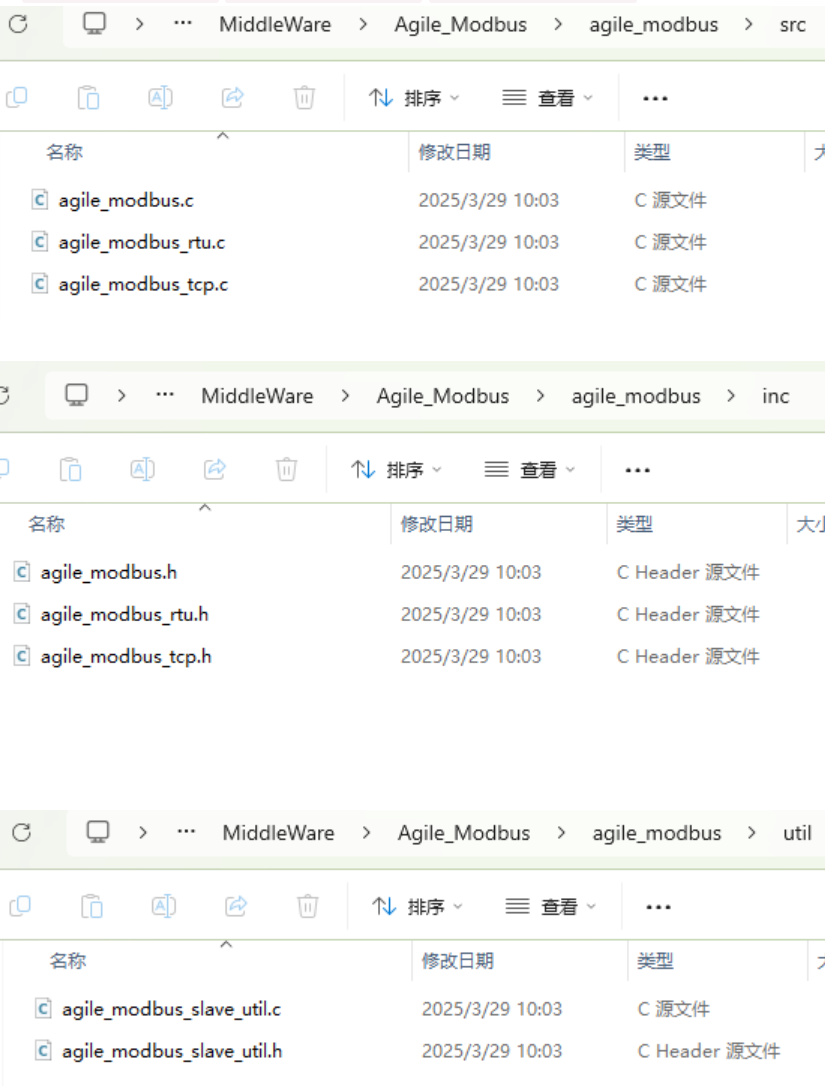 • 下载Agile Modbus源码:从GitHub下载Agile Modbus库的源码,解压后找到agile_modbus/inc、agile_modbus/src和agile_modbus/util三个文件夹。