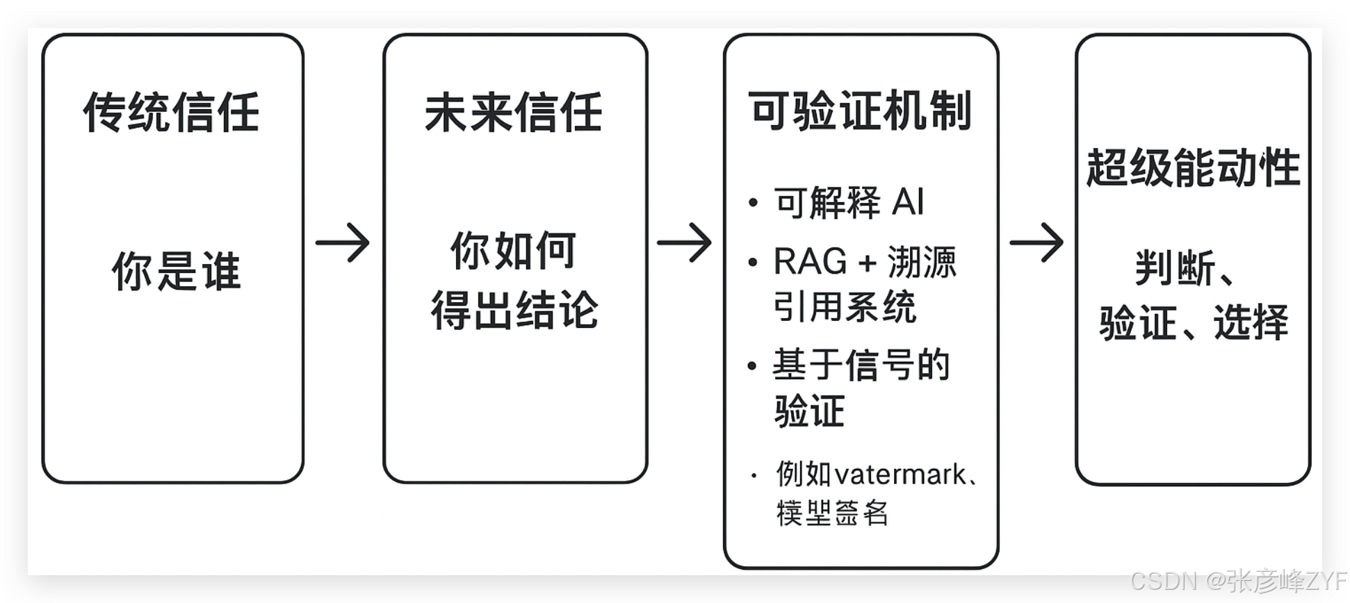 《AI赋能》中的原则 2 指出,在 AI 生成内容无处不在、真假交织的环境下,传统基于身份或权威的信任模式已经失效。未来的信任,将依赖可验证、可追溯、可对齐的系统机制,而非单点源头(专家、媒体或机构)。这一转变不仅是社会层面的认知重构,更是技术层面的深刻挑战。