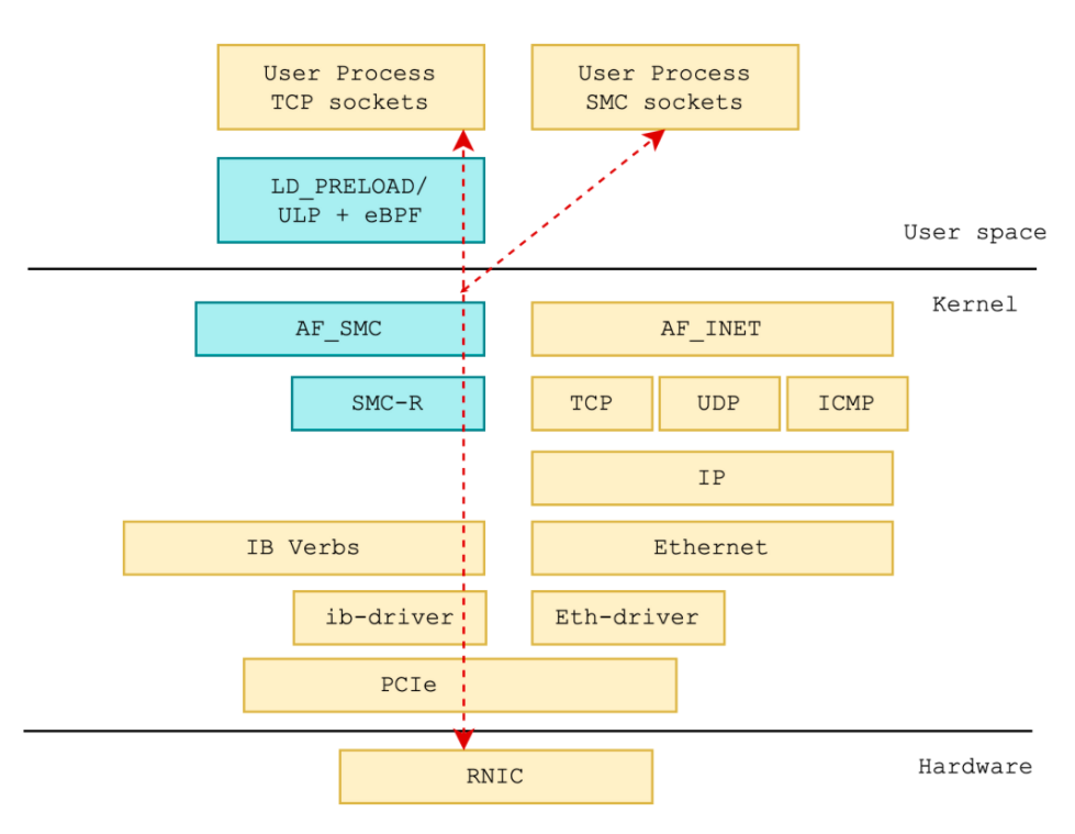 Shared Memory Communication over RDMA (SMC-R) 是一种基于 RDMA 技术、兼容 socket 接口的内核网络协议,由 IBM 提出并在 2017 年贡献至 Linux 内核。SMC-R 能够帮助 TCP 网络应用程序透明使用 RDMA,获得高带宽、低时延的网络通信服务。阿里云云上操作系统 Alibaba Cloud Linux 3 以及龙蜥社区开源操作系统 Anolis 8 配合神龙弹性 RDMA (eRDMA) 首次将 SMC-R 带上云上场景,助力云上应用获得更好的网络性能:《技术揭秘:阿里云发布第四代神龙 ,SMC-R 让网络性能提升 20%》。