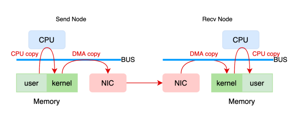 随着数据中心、分布式系统、高性能计算领域的快速发展,网络设备性能进步显著,主流物理网络带宽已达到了 25-100 Gb/s,网络时延也进入了十微秒的时代。然而,**网络设备性能提升的同时一个问题也逐渐显露:网络性能与 CPU 算力逐渐失配。**传统网络中,负责网络报文封装、解析和用户态/内核态间数据搬运的 CPU 在高速增长的网络带宽面前逐渐显得力不从心,面临越来越大的压力。以 TCP/IP 网络的一次数据发送与接收过程为例。发送节点 CPU 首先将数据从用户态内存拷贝至内核态内存,在内核态协议栈中完成数据包封装;再由 DMA 控制器将封装好的数据包搬运到 NIC 上发送到对端。接收端 NIC 获得数据包后通过 DMA 控制器搬运到内核态内存中,由内核协议栈解析,层层剥离帧首或包头后再由 CPU 将有效负载 (payload) 拷贝到用户态内存中,完成一次数据传输。
