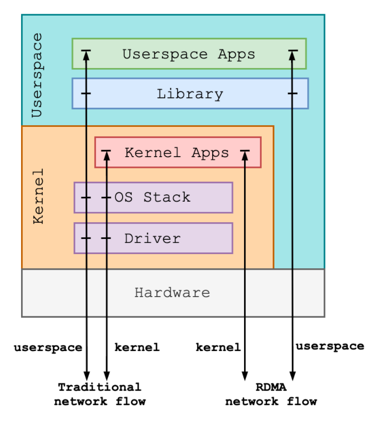 RDMA 网络依赖 RNIC 在网卡内部完成数据包封装与解析,旁路了网络传输相关的软件协议栈。对于用户态应用程序,RDMA 网络的数据路径旁路了整个内核;对于内核应用程序,则旁路了内核中的部分协议栈。由于旁路了软件协议栈,将数据处理工作卸载到了硬件设备,因而 RDMA 能够有效降低网络时延。