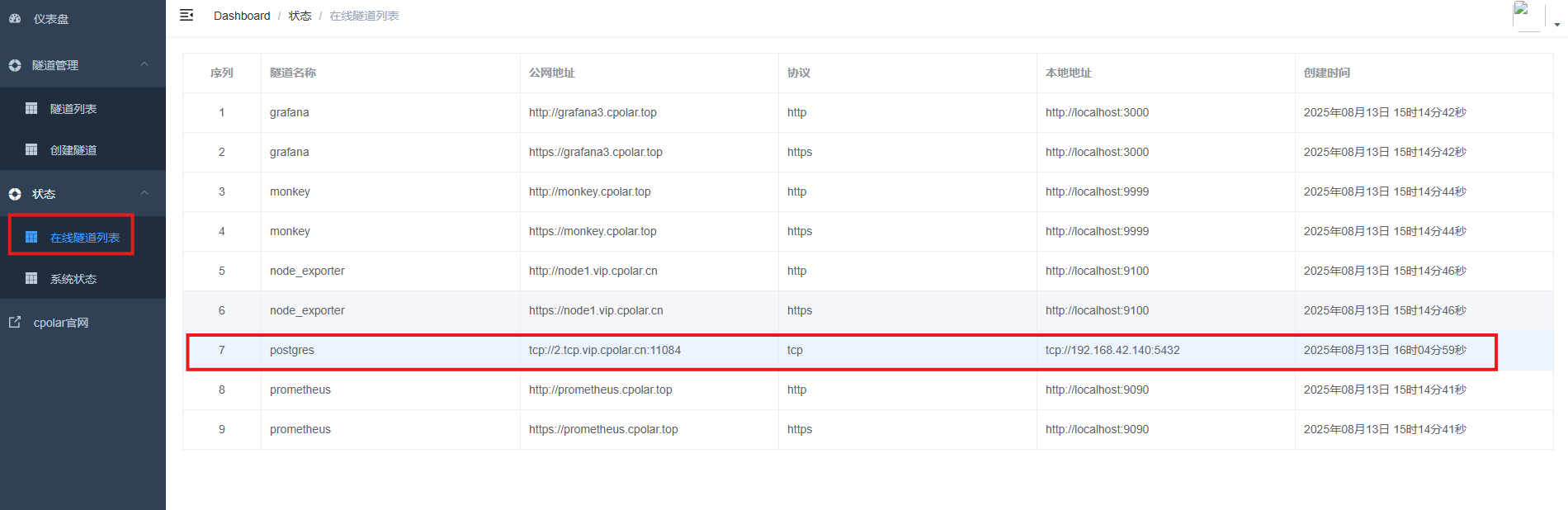 创建完成后,打开在线隧道列表,此时可以看到随机的公网地址已经发生变化,地址名称也变成了保留和固定的TCP地址。
