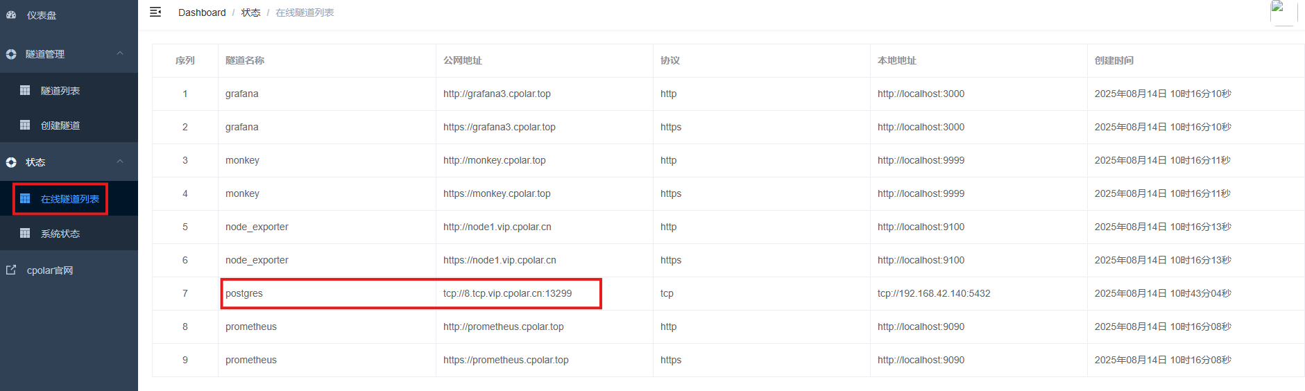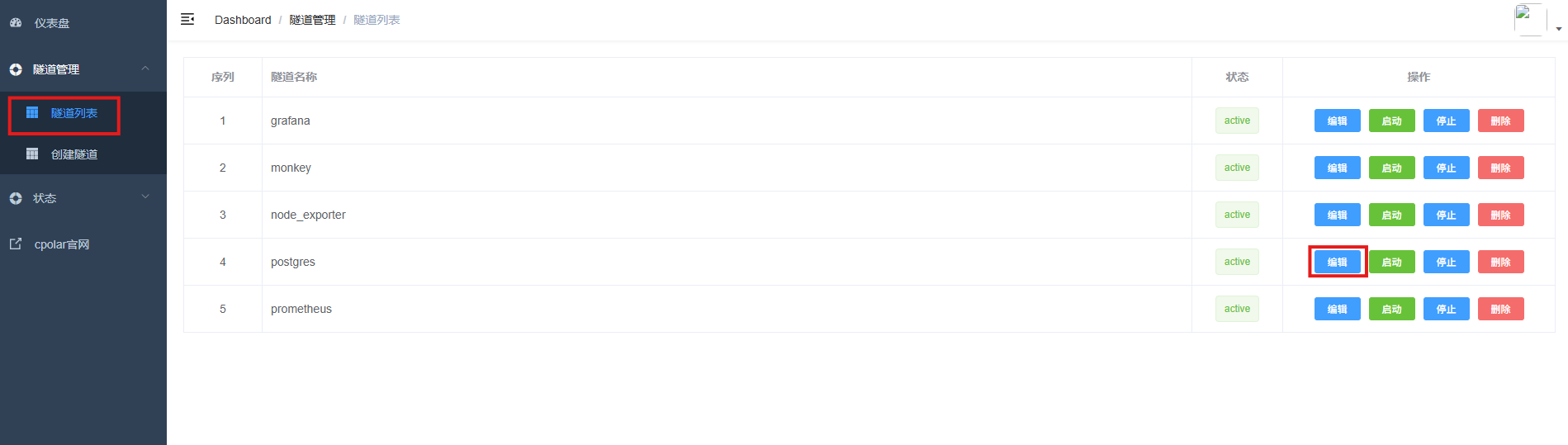 登录cpolar web UI管理界面,点击左侧仪表盘的隧道管理------隧道列表,找到所要配置的隧道postgres,点击右侧的编辑。