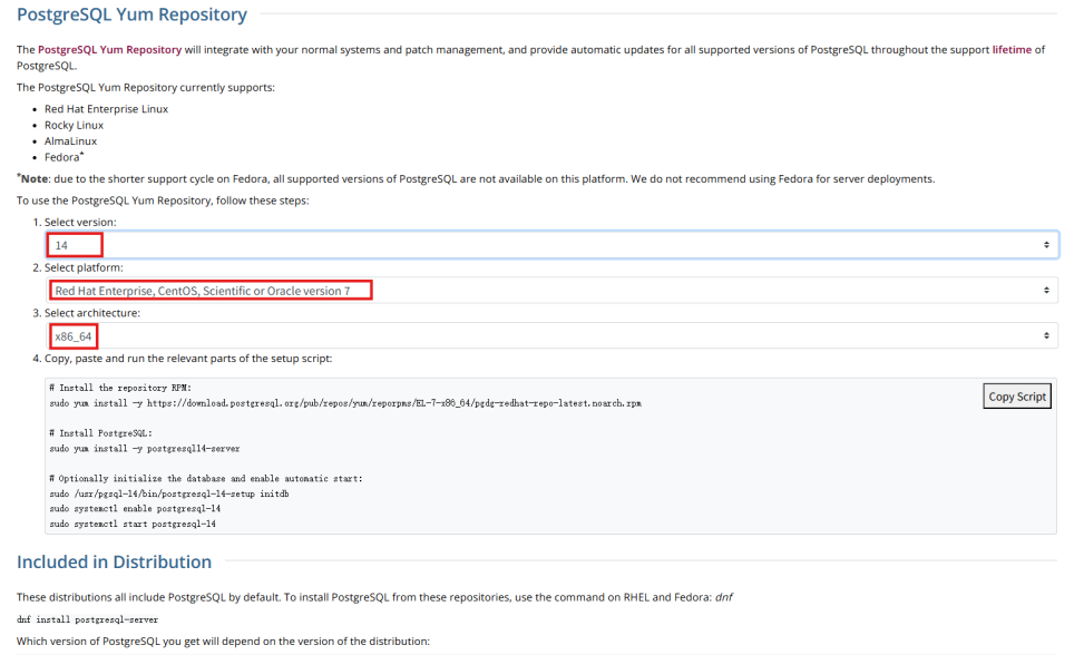 在官网上选择 Linux系统,使用 yum来下载软件,只需选择对应版本和平台,即可生成下载和安装的脚本。