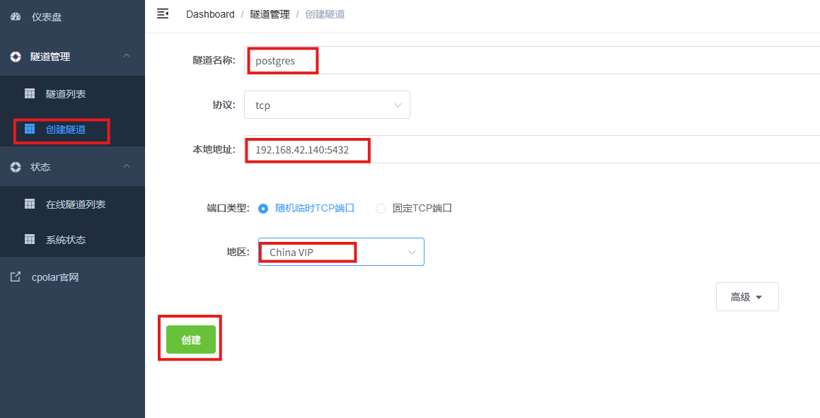 - 隧道名称:可自定义,本例使用了:postgres,注意不要与已有的隧道名称重复
