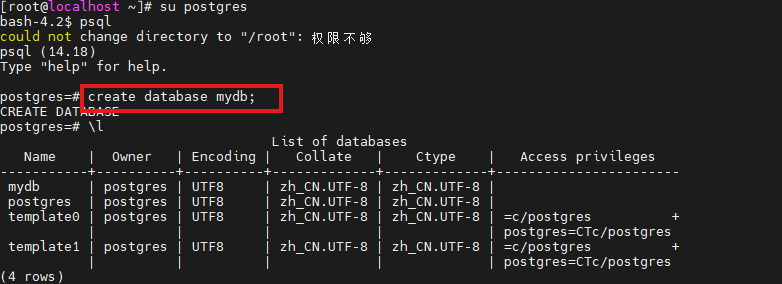切换到postgres用户,新建mydb库: