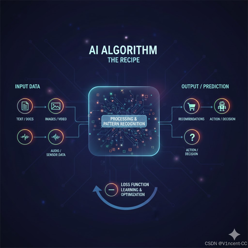 - 损失函数 (Loss Function): 衡量算法实际输出与预期输出之间的差异,可以理解为 AI 衡量自己犯错程度的指标,损失函数值越低,性能越好。