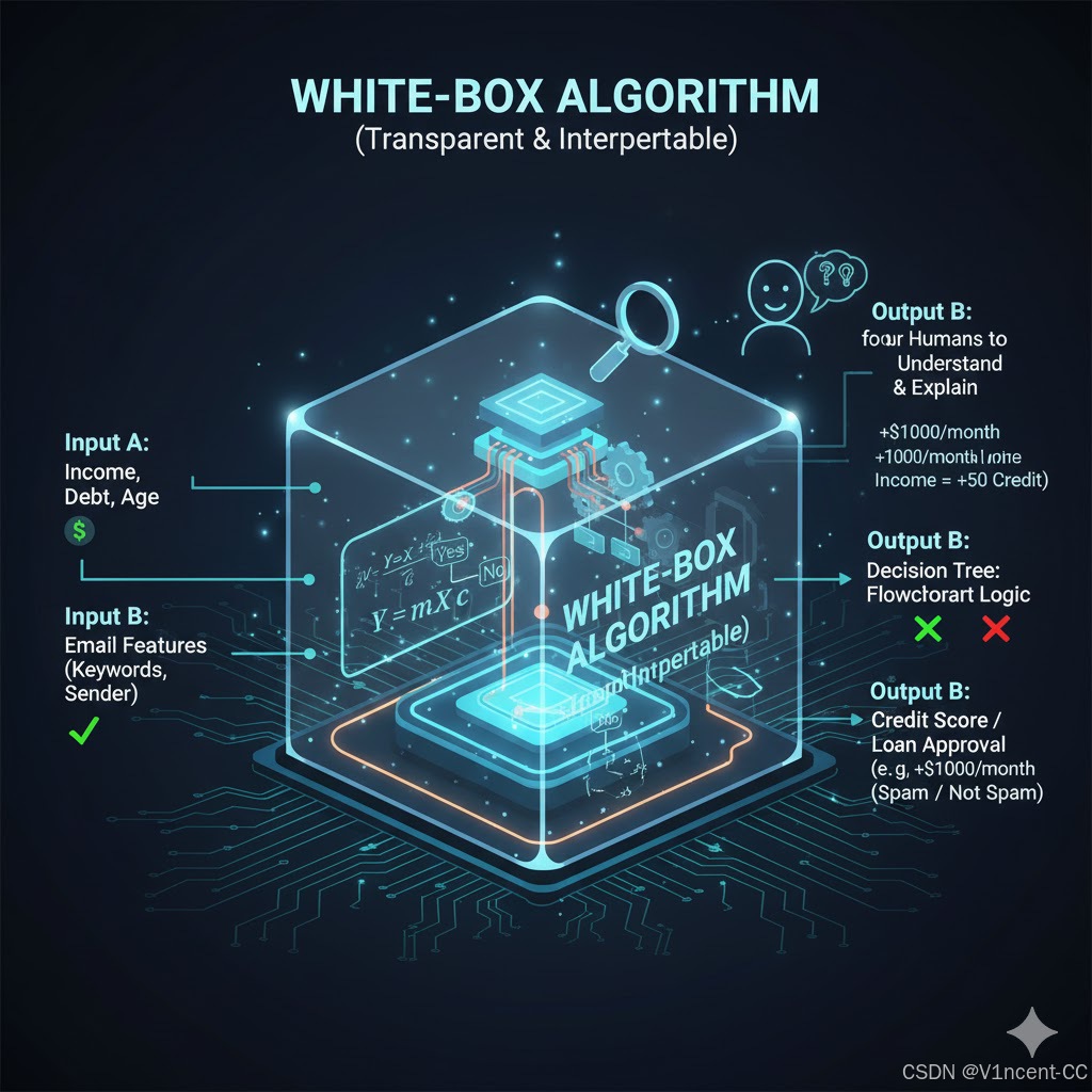 透明算法也被称为"白盒算法",因为它们的内部决策过程是清晰、可追踪和易于理解的,就像看着一个透明的盒子内部运作一样。核心特点:逻辑简单,容易解释,人类可以轻松地理解输入和输出之间的关系。