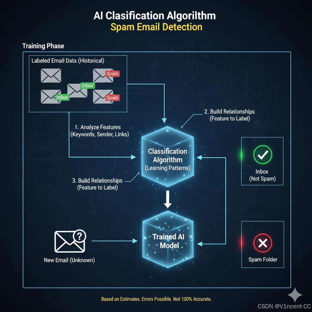 当新的数据输入模型时,模型可以根据从训练数据中学习到的关系,将其分类为"垃圾邮件"或"非垃圾邮件"。然而务必记住,模型实际上是根据训练数据进行估算的,虽然这种方法可能非常准确,但错误是不可避免的,AI无法做到100%准确率。