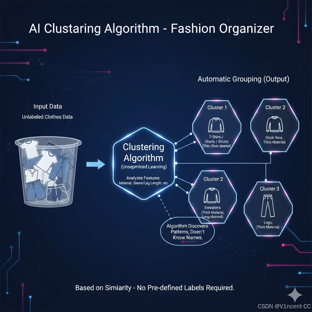 - 处理:算法观察数据特征,分析每件衣服的特点,比如材质、袖子长度、腿部长度等,将具有相同特征的衣服总结为一类。