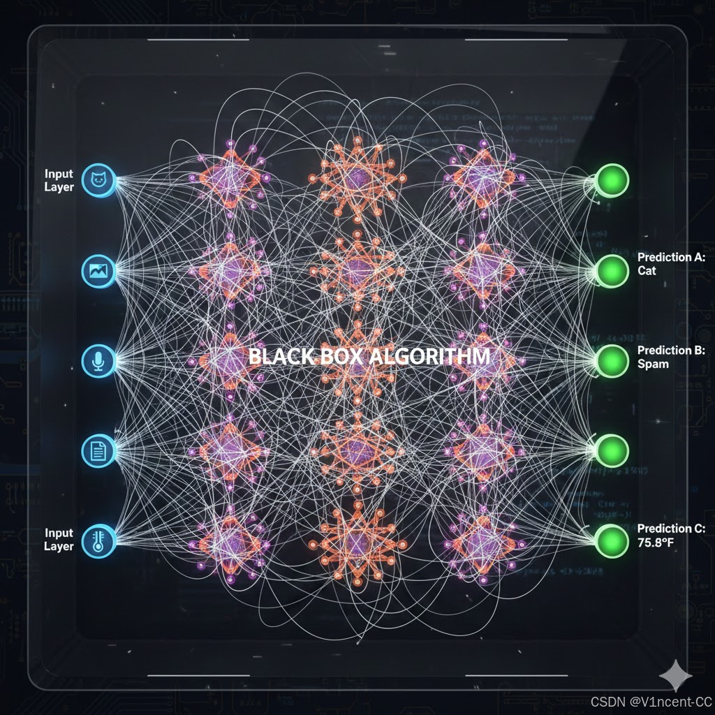 黑盒算法之所以被称为"黑盒",是因为它们的内部运作机制极其复杂和不透明,我们很难或无法理解它是如何从输入数据得到最终结果的。这类算法通常由数百万甚至数十亿的参数组成,它们在多层复杂的结构中进行非线性转换,使得人类几乎不可能追踪整个决策链。
