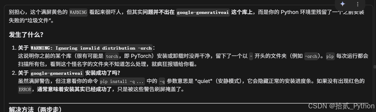 如果显示 Package not found,那就再运行一次安装命令(这次把 -q 去掉,方便看进度):pip install -U google-generativeai