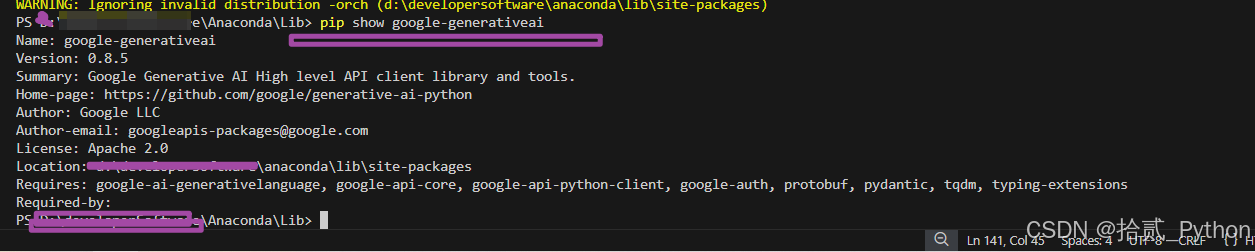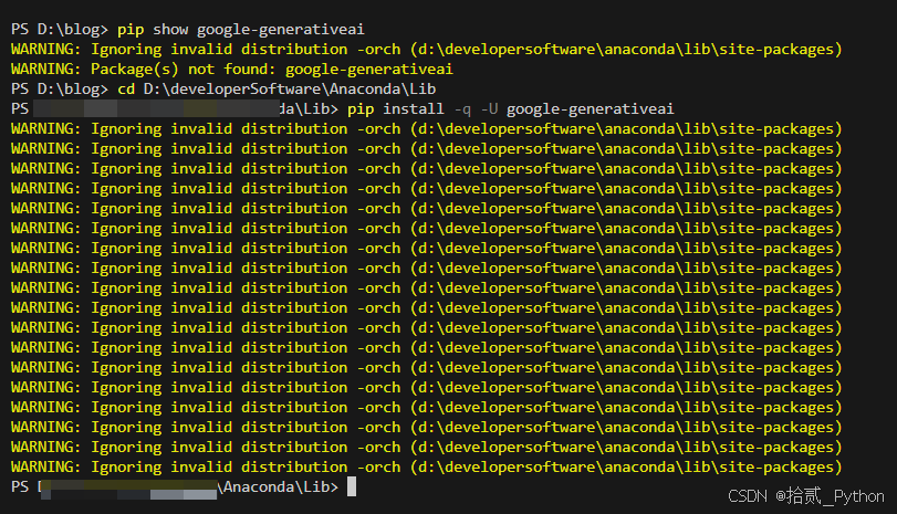 删掉垃圾文件后,回到你的终端(CMD 或 PowerShell),再次运行我们在上一步里教你的验证命令:pip show google-generativeai