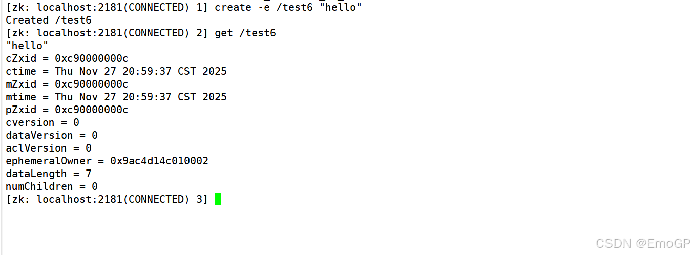ephemeralOwner:如果当前节点是临时节点,该值是当前节点所有者的session id,如果节点不是临时节点,则该值为0