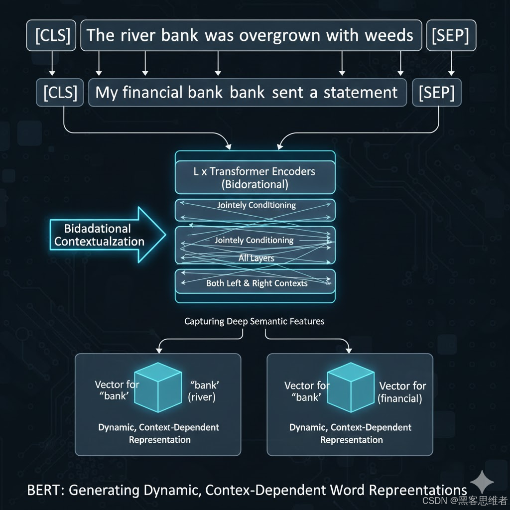 - 深度机制: BERT 通过联合调节所有层中的左侧和右侧上下文,有效捕捉文本的深层语义特征,能够为每个词汇生成动态的、上下文相关的表示。
