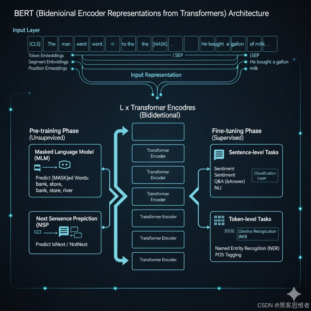 [CLS](用于分类任务的聚合表示)和[SEP](用于分隔句子对)标记,并使用**段嵌入(Segment Embeddings)**区分不同句子。 - 应用广泛性: 这种统一的输入格式和架构,使得 BERT 可通过简单的微调,适应句子级任务(如分类)和标记级任务(如命名实体识别),极大地简化了开发流程。