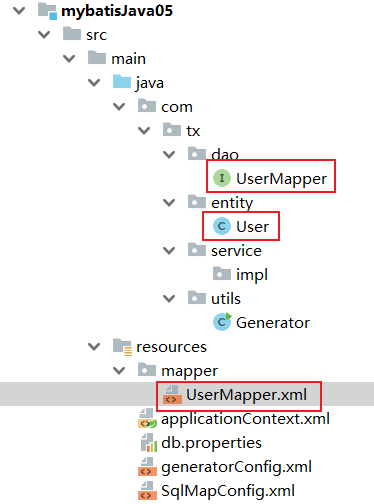 执行逆向工程配置文件目录要匹配正确,运行反向类后,会自动生成User实体类、UserMapper接口、UserMapper.xml文件