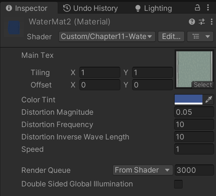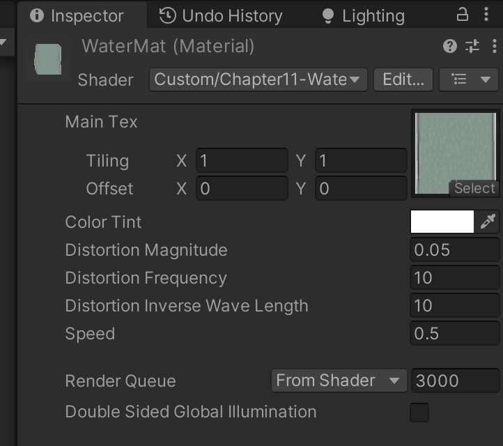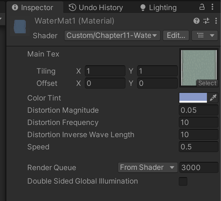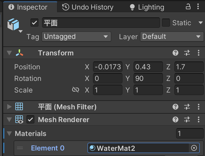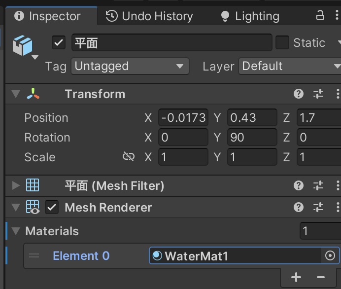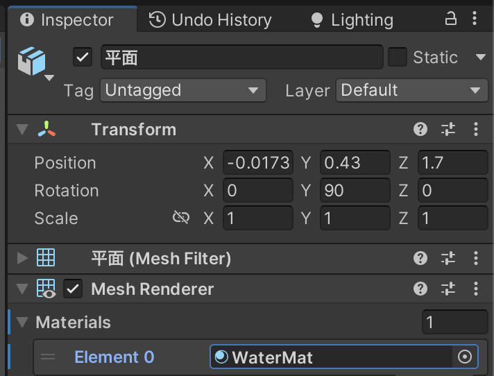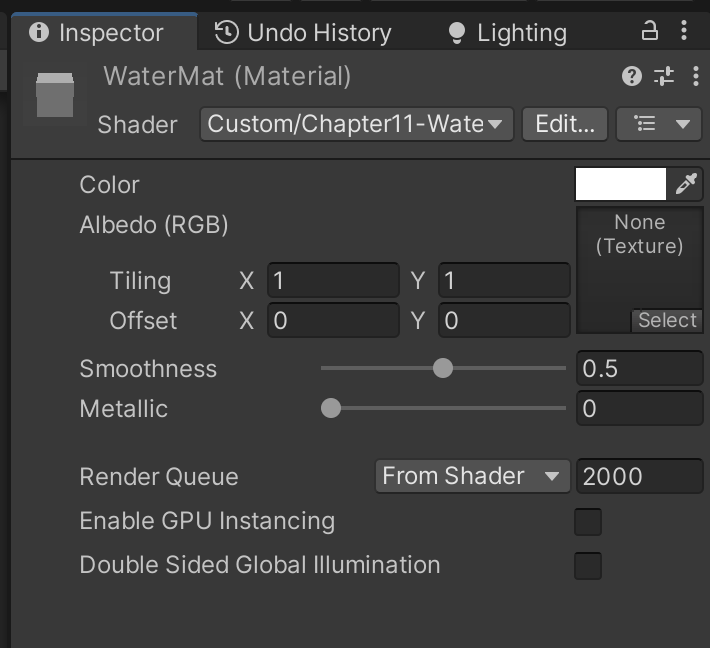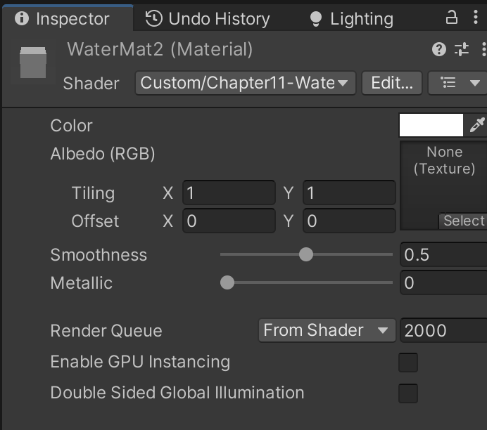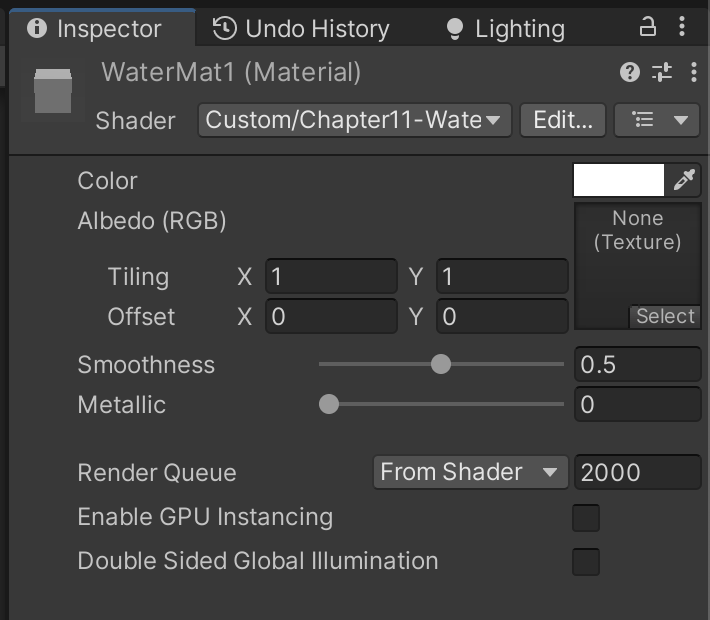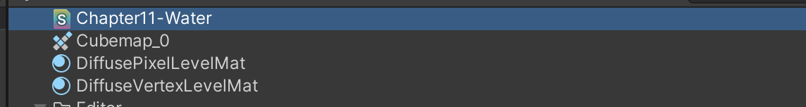 (3)新建一个Unity Shader。在本书资源中,该Shader名为Chapter11-Water。把新的Shader赋给第2步中创建的材质。