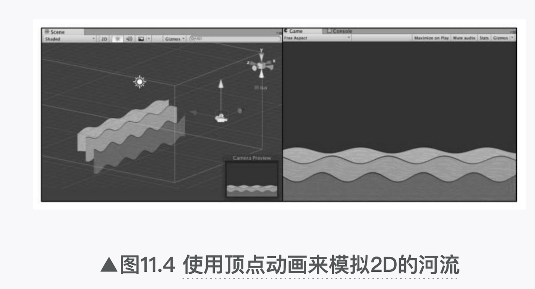 在本小节中,我们将学习如何模拟一个2D的河流效果。在学习完本节后,我们可以得到类似图11.4中的效果。当单击运行后,可以观察到河流不断流动的效果。