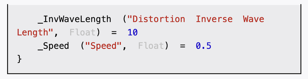 _InvWaveLength ("Distortion Inverse Wave Length", Float) = 10 //_InvWaveLength用于控制波长的倒数(_InvWaveLength越大,波长越小)
