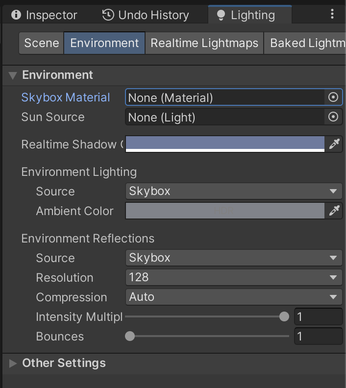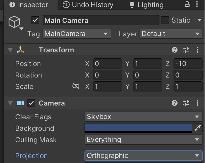 (1)新建一个场景。在本书资源中,该场景名为Scene_11_3_1。在Unity 5.2中,默认情况下场景将包含一个摄像机和一个平行光,并且使用了内置的天空盒子。在Window → Lighting →Skybox中去掉场景中的天空盒子。由于本节模拟的是2D效果,因此我们需要把摄像机的投影类型设置为正交投影。