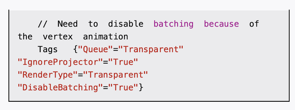 Tags {"Queue"="Transparent" "IgnoreProjector"="True" "RenderType"="Transparent" "DisableBatching"="True"}