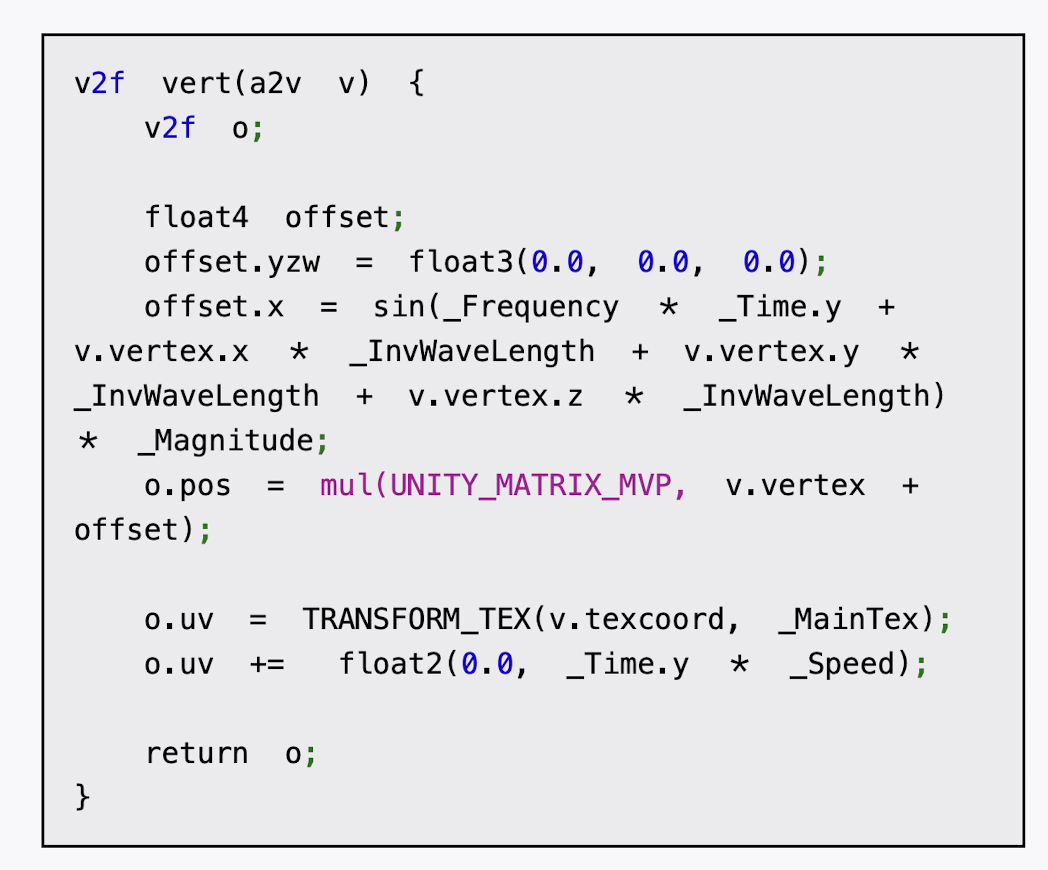 o.pos = mul(UNITY_MATRIX_MVP, v.vertex + offset); //位移量添加到顶点位置上,再进行正常的顶点变换即可。