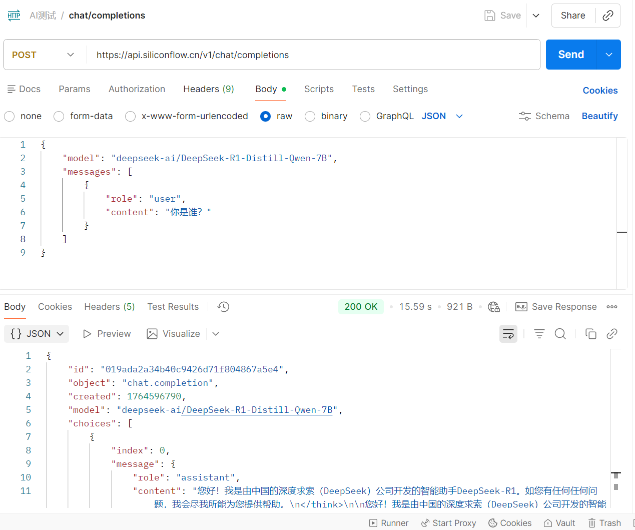 打开Postman,创建一个post请求,按如上格式拼接请求内容并发送,即可看到大模型的返回: