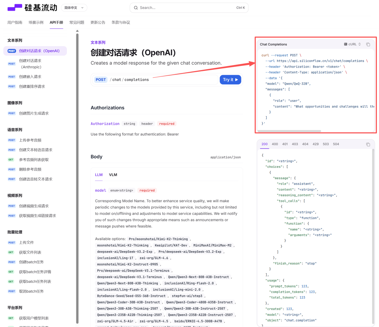API文档是通用文档,并非针对该模型。这里给出的是一个对话请求文档,重点在右上角:
