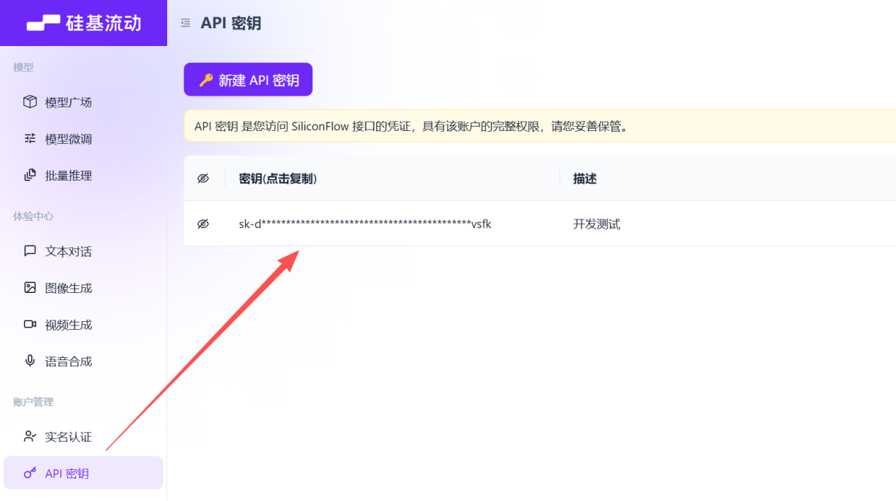 登录控制台后,在左侧的API 密钥菜单中新建API密钥。
