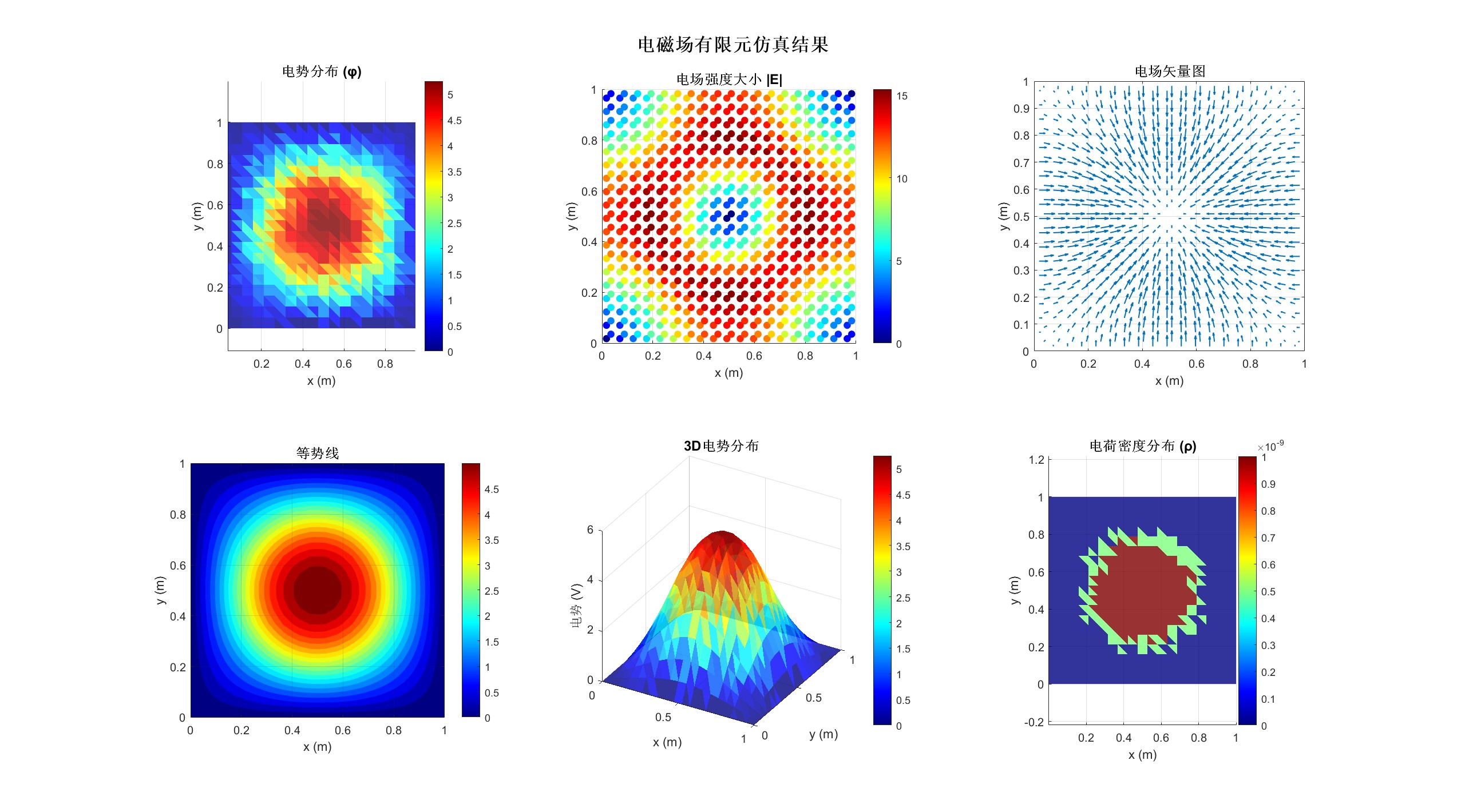 通过这个简单的例子,我们完成了二维静电场的有限元仿真。虽然问题相对简单,但它涵盖了有限元方法的核心步骤:网格生成、系统组装、边界条件处理、求解和可视化。希望这个例子能激发你对电磁场仿真和有限元方法的兴趣。你可以尝试修改电荷密度分布、边界条件或几何形状,来探索不同的仿真场景。