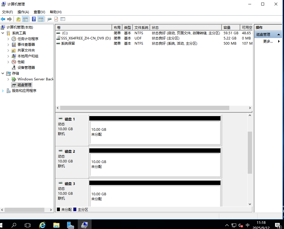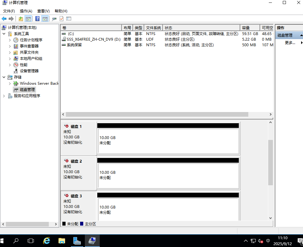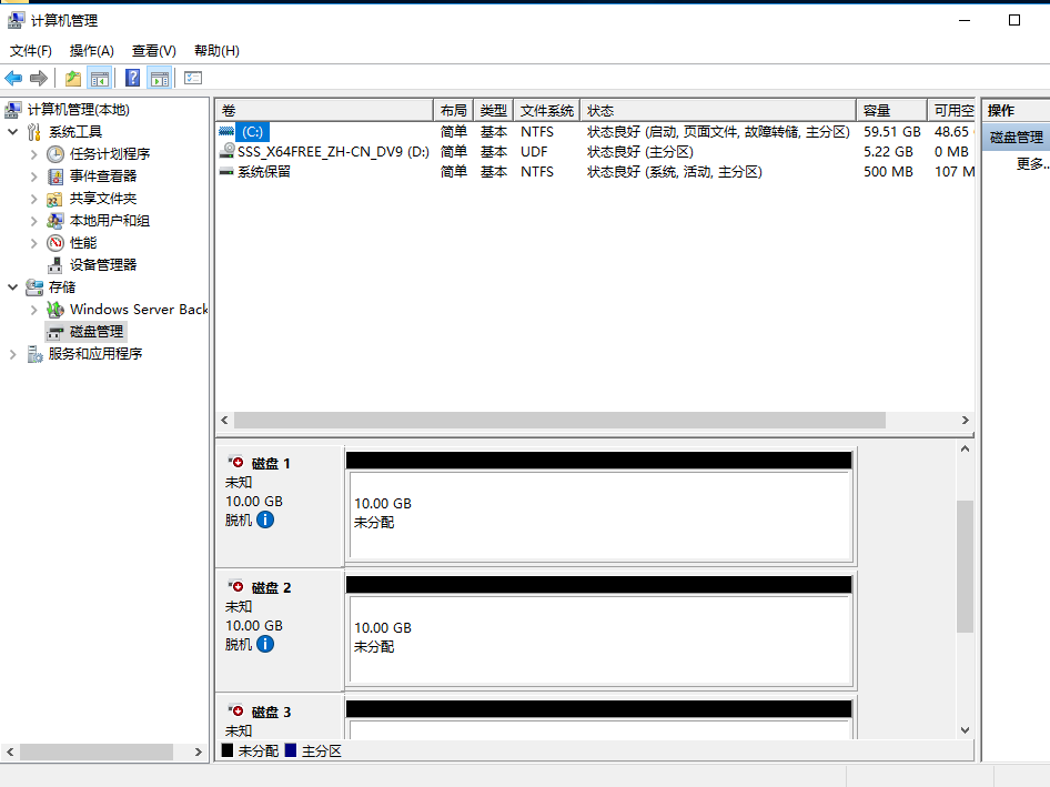 展开【存储】→【磁盘管理】,下拉垂直滚动条,可见3块"未联机"磁盘(编号为磁盘1、磁盘2、磁盘3,系统盘为磁盘0)