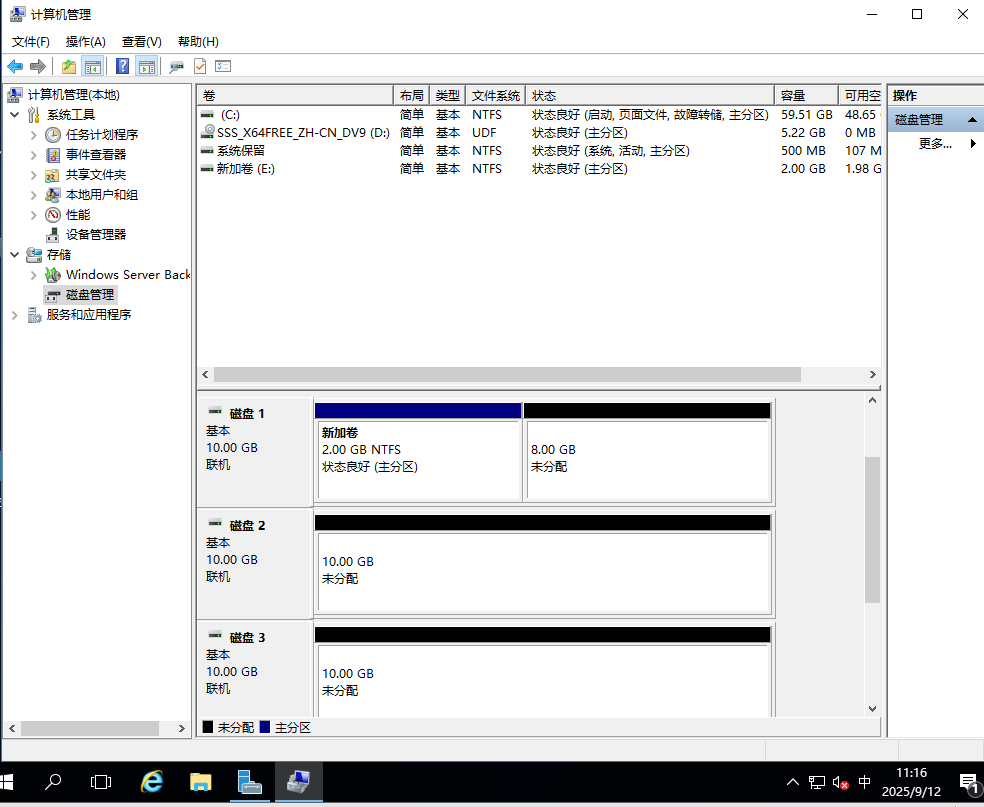 删除E:和F:卷,恢复3块磁盘为未分配空间