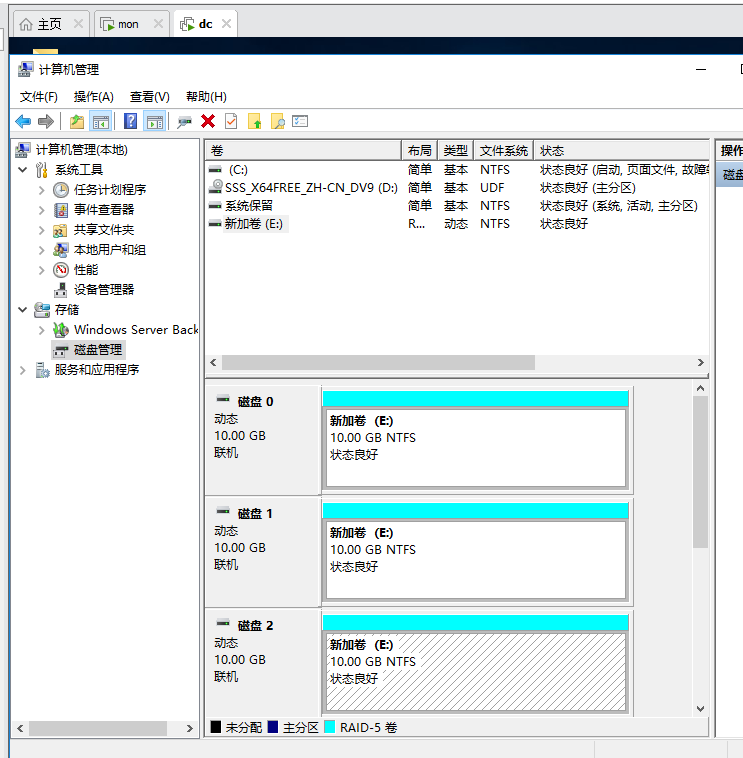 结果验证:E盘容量20GB(10GB×3 - 10GB校验空间),磁盘管理显示"RAID-5卷"。
