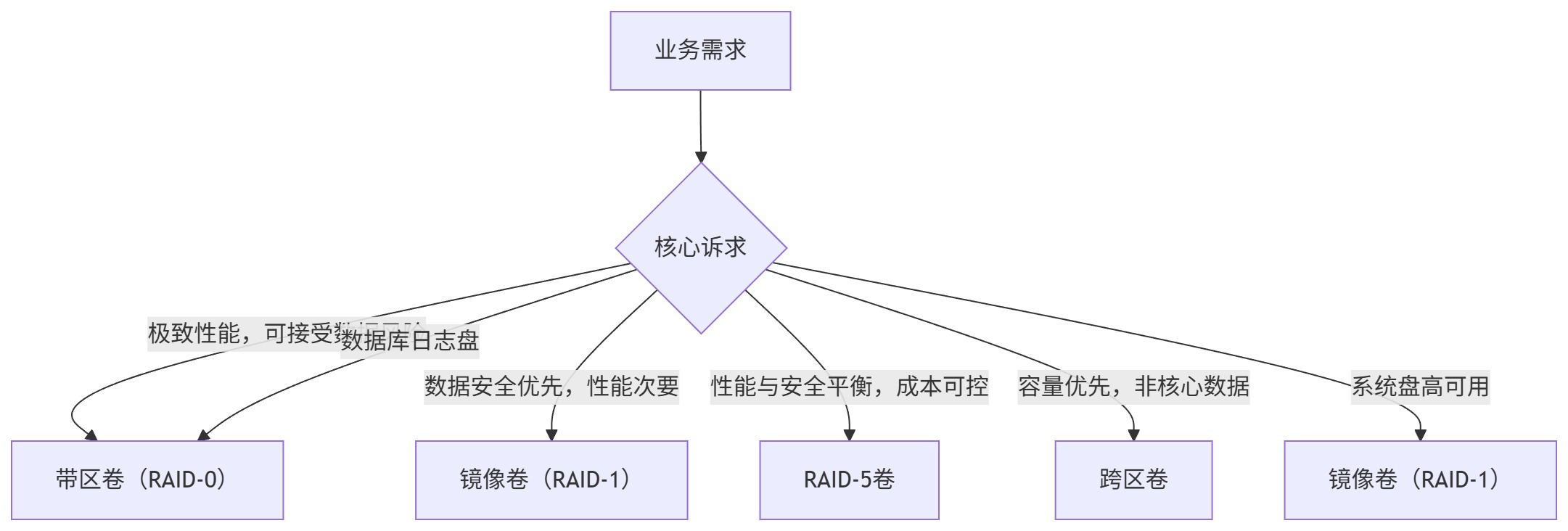 | 核心能力 | 仅支持创建/删除/扩展简单分区,无容错 | 支持跨盘卷、带区卷、镜像卷、RAID-5卷 | RAID-5卷支持在线扩容,无需中断业务 |