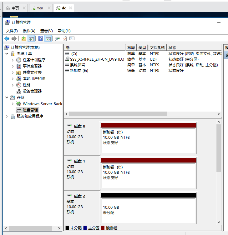 - 删除带区卷,右键磁盘1未分配空间→【新建镜像卷】→勾选磁盘1、2→容量10GB→驱动器号E:→完成
