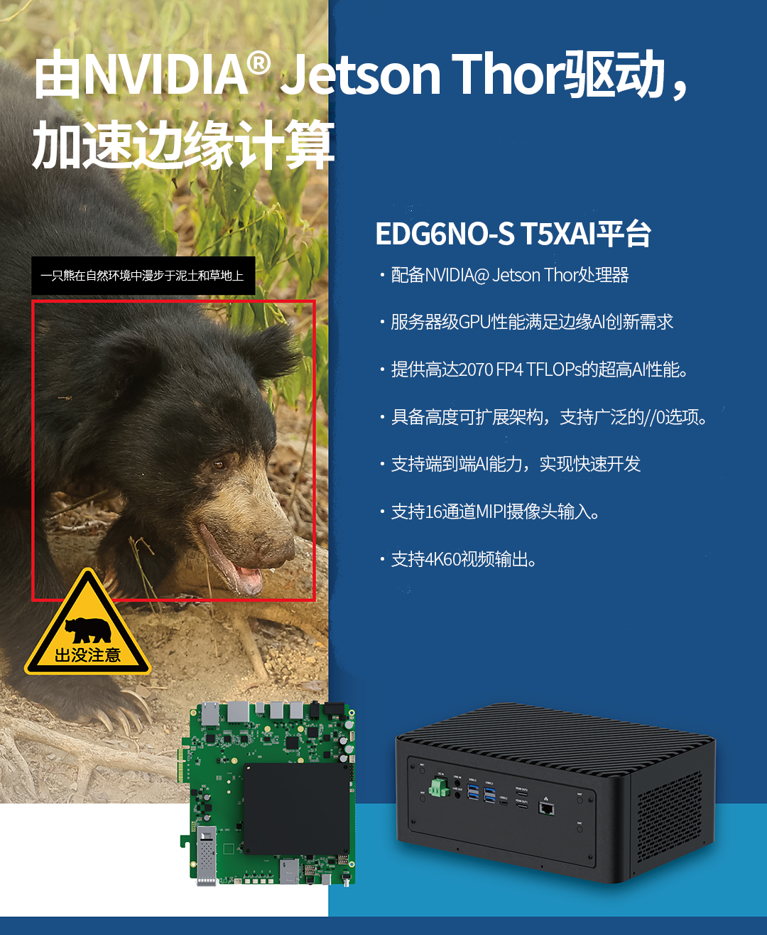 视程空间的 EDG6N0-S T5X 搭载 NVIDIA® Jetson Thor™,最高运算能力达 2070 FP4 TFLOPS,结合多模态 AI 与 VLM 技术,可即时检测火灾、倒塌、事故以及如熊等野生动物威胁。通过摄像机与机器人视觉技术,它提升都市安全监控、应急反应与环境感知,为关键场景提供快速且智慧的感知能力。