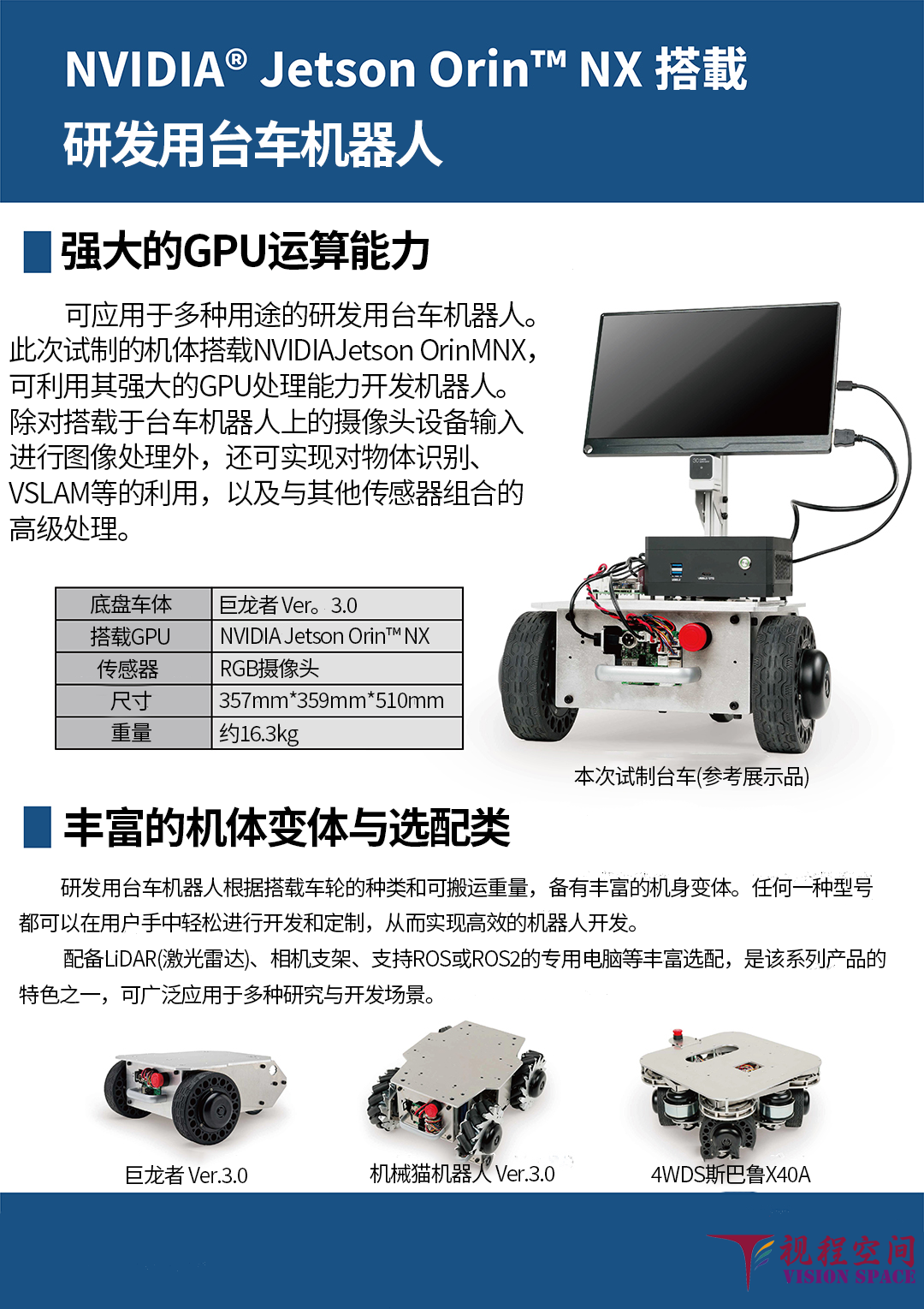 Vstone 专注于仓储自动化与智慧物流解决方案,展示了其搭载 视程空间 Pandora 平台的机器人系统,基于 NVIDIA® Jetson Orin™ NX Super 架构。该系统整合 ROS / ROS2 与多种传感器,能实现即时物体检测、路径规划及 3D 建图,适用于自动导引车 (AGV)、仓储检查及智慧运输场景。