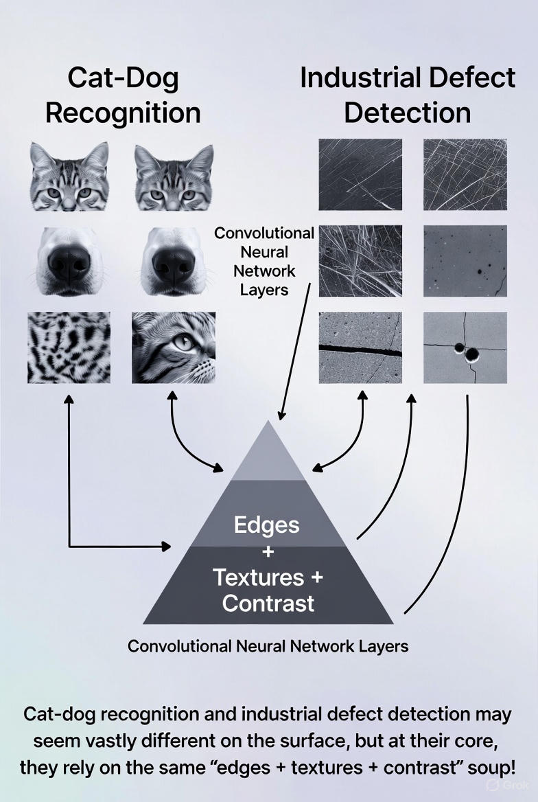这两个任务好像八竿子搭不到边,但在图像学习的逻辑里,它们虽然一个识别动物,一个识别零件瑕疵,但其实都依赖基础特征: