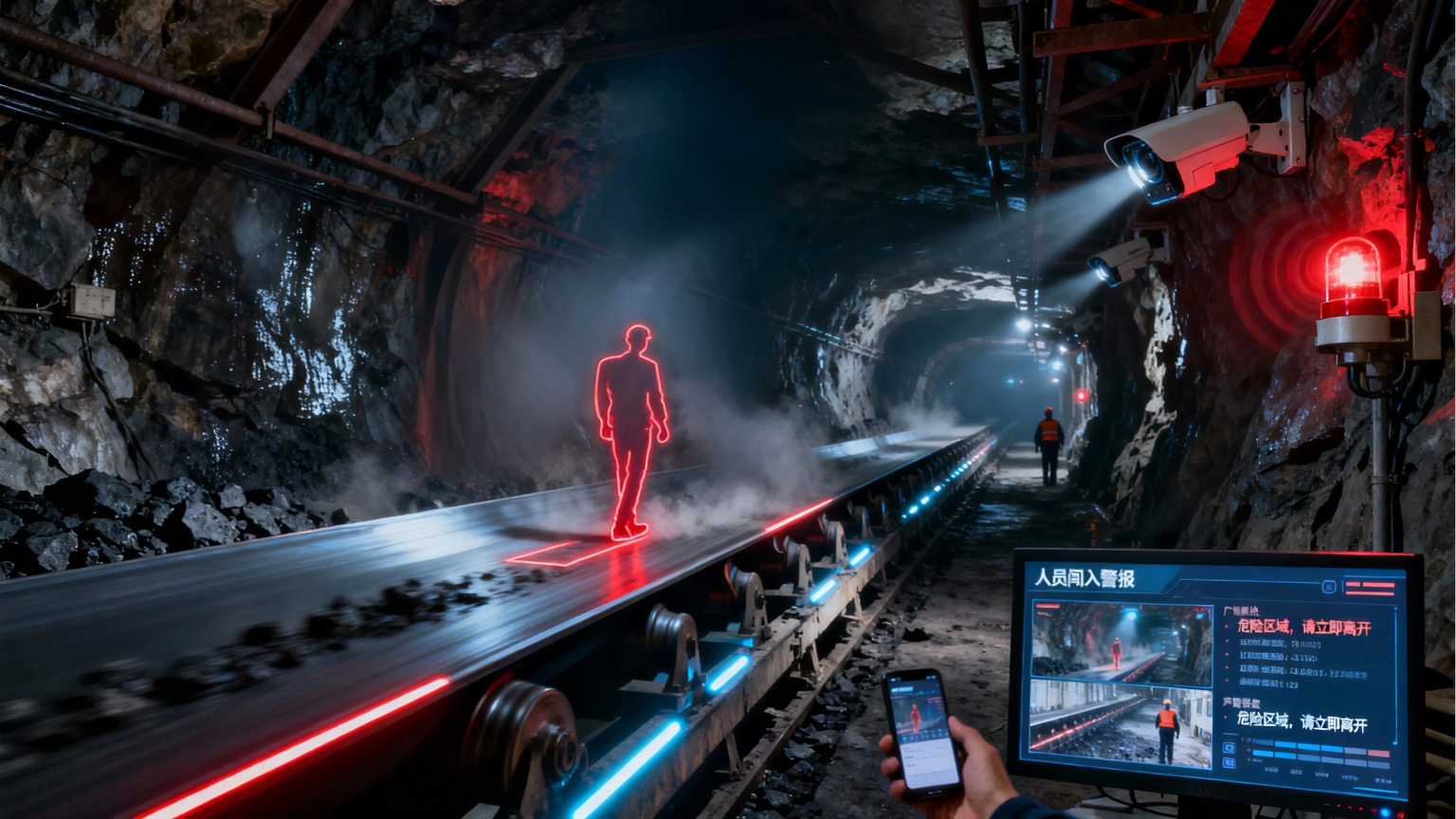 煤矿的皮带运输系统通常较为庞大且复杂,覆盖范围广。在日常生产过程中,由于人员流动频繁,尤其是在交接班、设备检修等特殊时段,人员误闯入皮带区域的风险显著增加。传统的安全值守方式主要依赖人工巡查,这种方式存在诸多局限性。一方面,人工巡查无法做到实时、全面监控,容易出现监管漏洞;另一方面,长时间的值守容易导致人员疲劳,降低警觉性,从而无法及时发现和制止人员闯入行为。此外,煤矿环境复杂,光线、粉尘等因素也会影响人工值守的效果。因此,急需一种更加高效、可靠的技术手段来加强皮带区域的安全防护。
