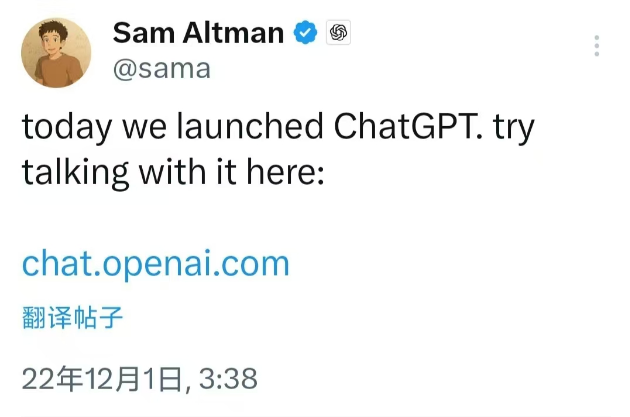 2022年11月30日(美国时间),OpenAI低调发布了基于GPT-3.5架构的ChatGPT。12月1日,Sam Altman在Twitter上正式宣布了这一消息,邀请全球用户尝试与其对话 1。这一看似简单的聊天机器人界面,实则隐藏了RLHF(基于人类反馈的强化学习)带来的巨大对齐优势,解决了过往GPT-3模型在指令遵循上的痛点。