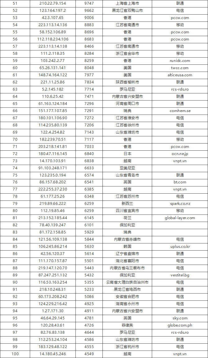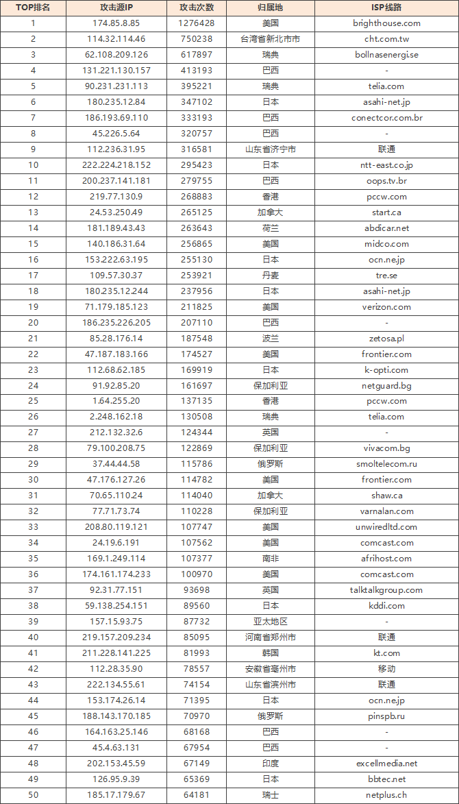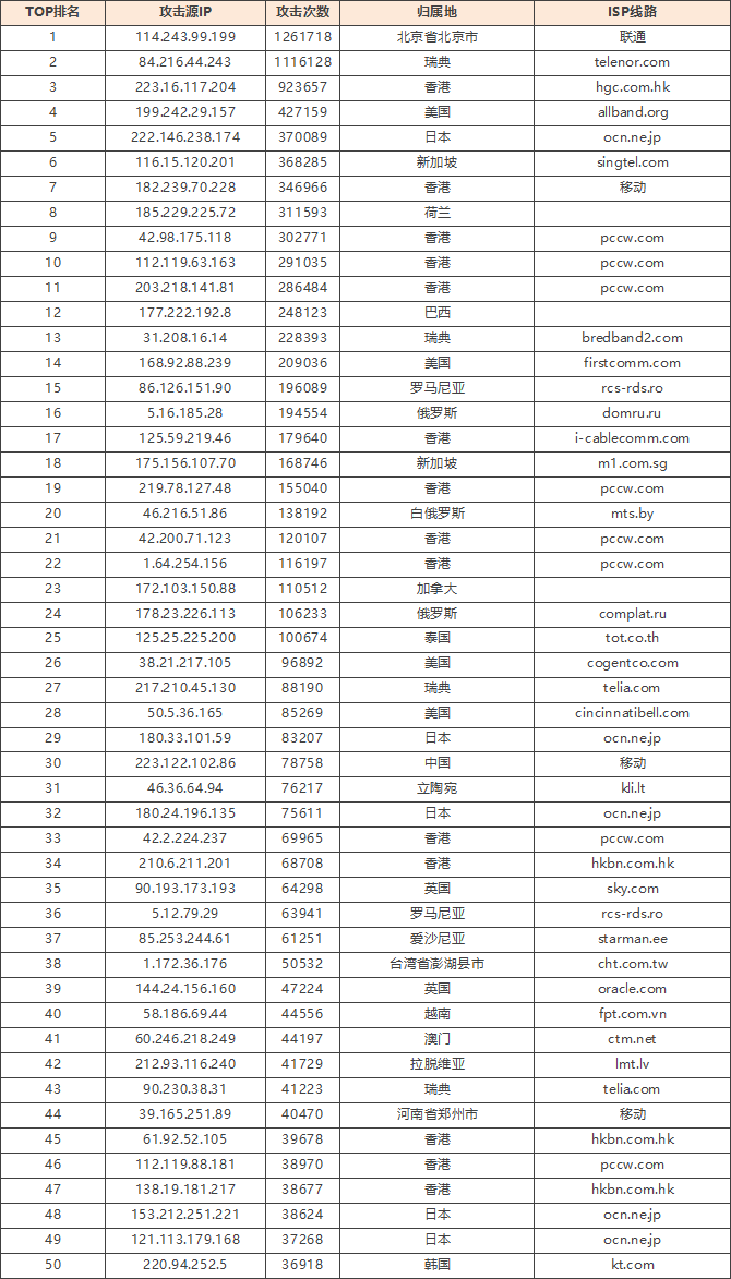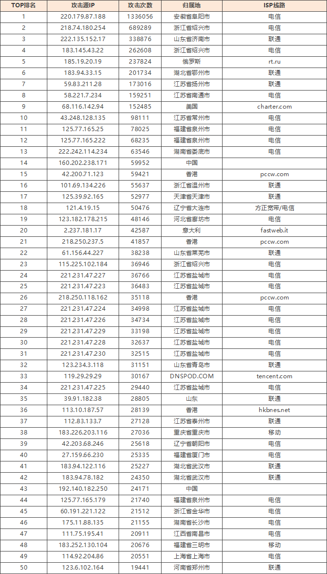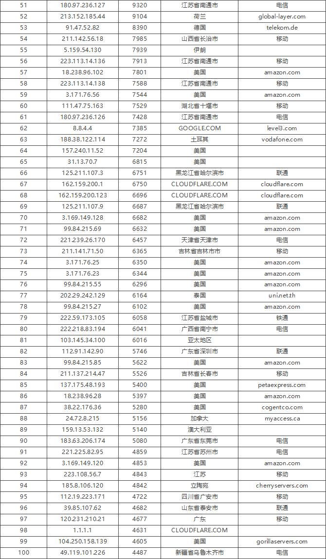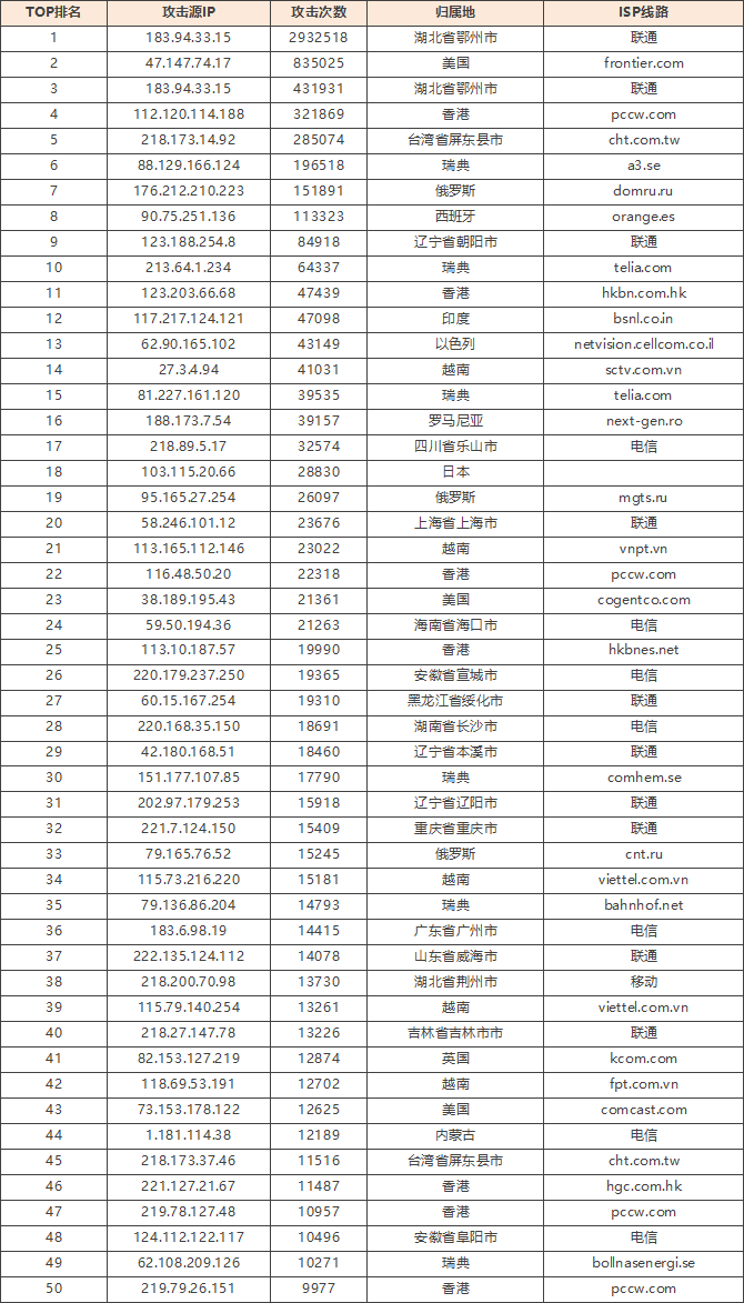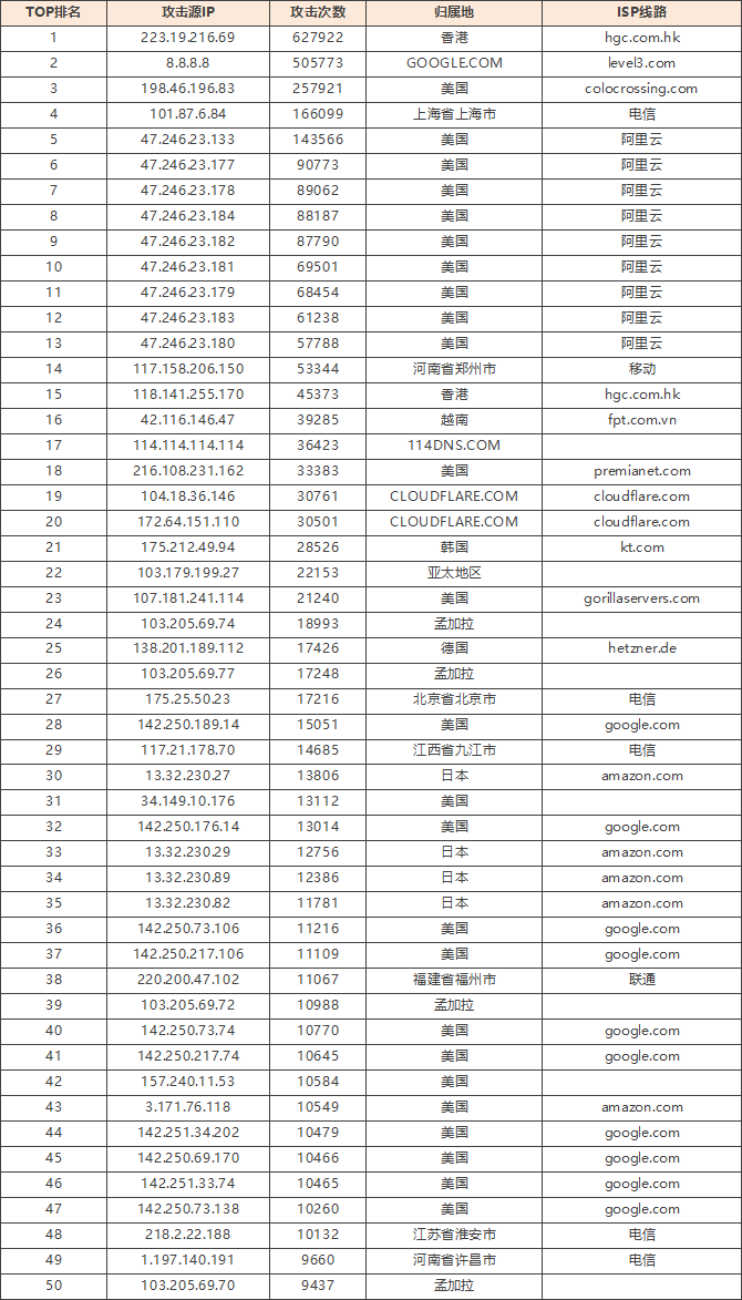 免责声明:因 IP 地理位置数据库存在更新延迟,报告中显示的属地和运营商信息仅供参考。鉴于 DDoS 攻击流量中可能存在虚假源 IP,如您将下列攻击源信息应用于网络安全设备策略,由此产生的误判或误拦后果,傲盾软件概不承担相关责任。