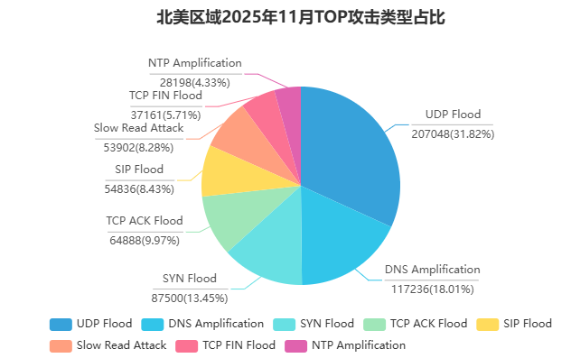 北美区域------ 攻击总次数 261,318 次,峰值达到 829.06 Gbps。攻击来源呈现明显全球化特征,亦包含大量云厂商节点、CDN 节点及公共 DNS 的异常流量。